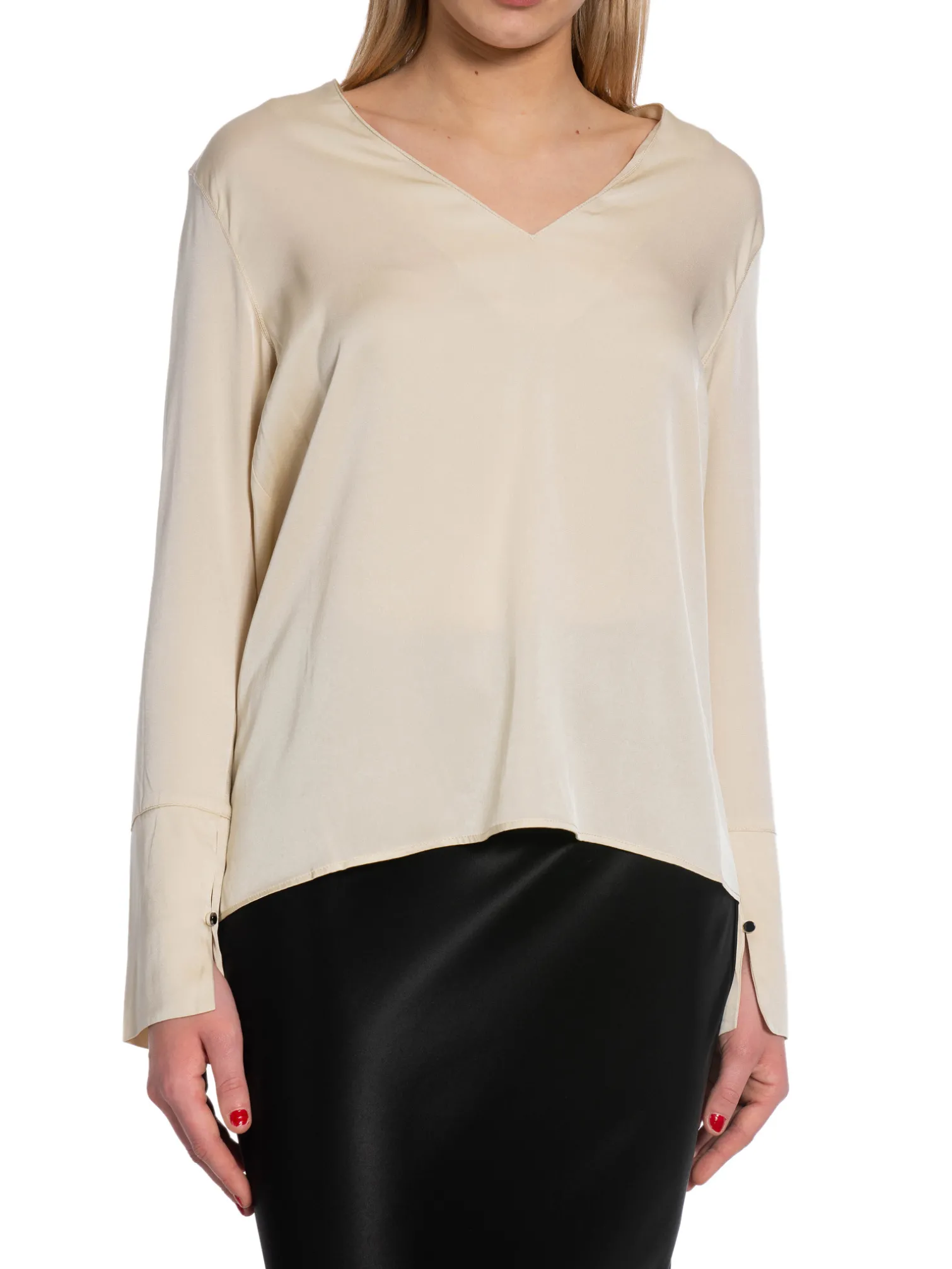Blouse Kelly from Ahlvar Gallery. An elegant V-neck blouse. Designed with long sleeves, double layer cuffs, slit and metallic button. Works on all occasions, all year round.