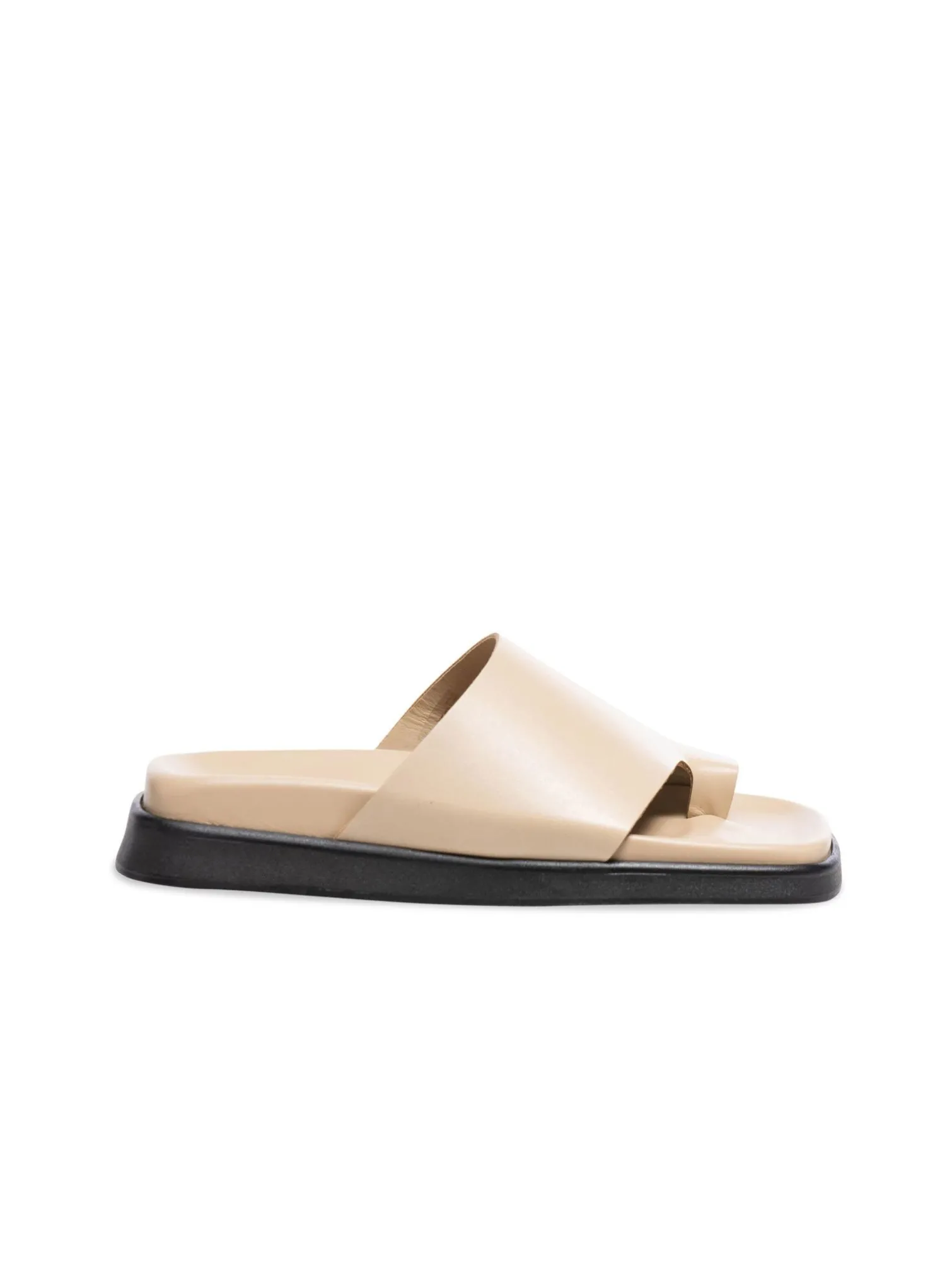 Sandal Toe Ring from Alohas. A pair of comfy slip-in sandals in black leather with a soft sole in leather. Designed with a toe ring at the front which creates a clean modern look. The shaped sole gives a comfortable fit. The sole measures Ca 2 cm. Wear with the summer dresses and comfortable pants to get a classic stylish look!