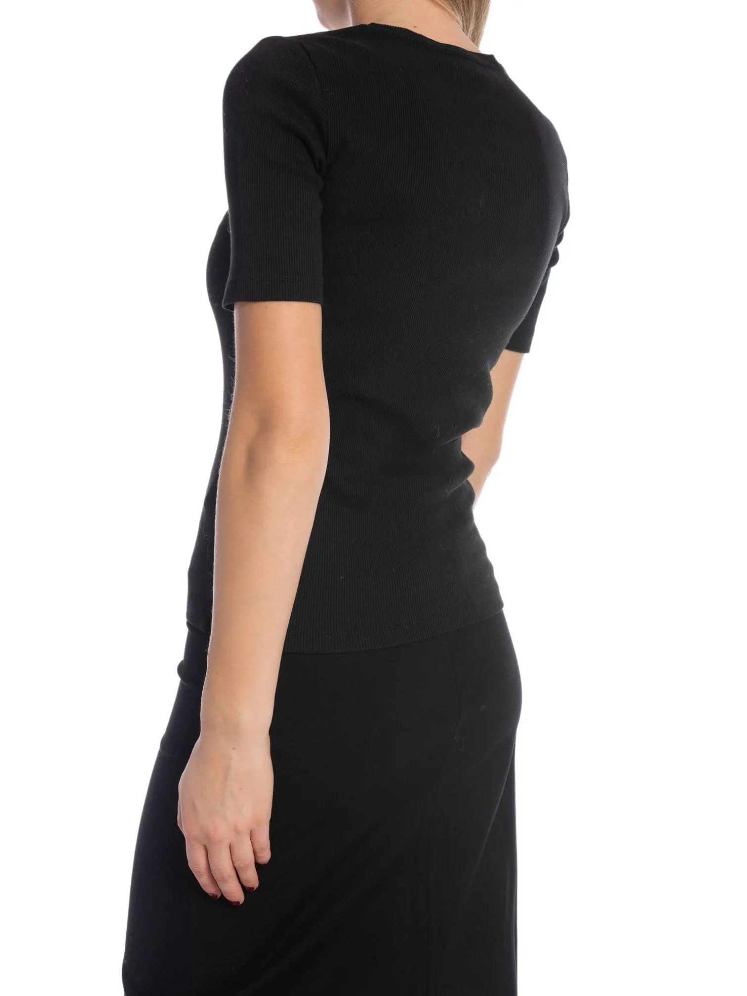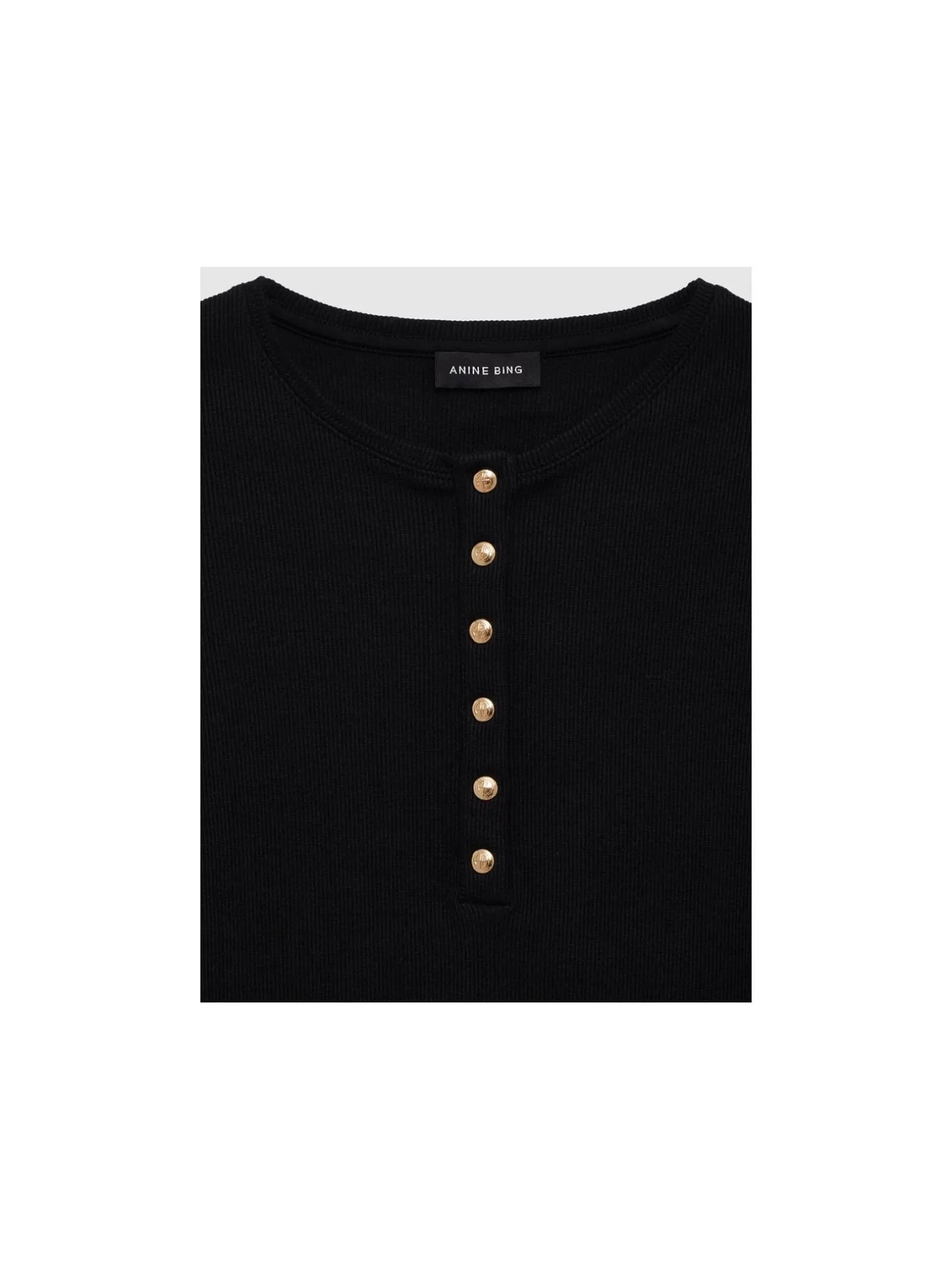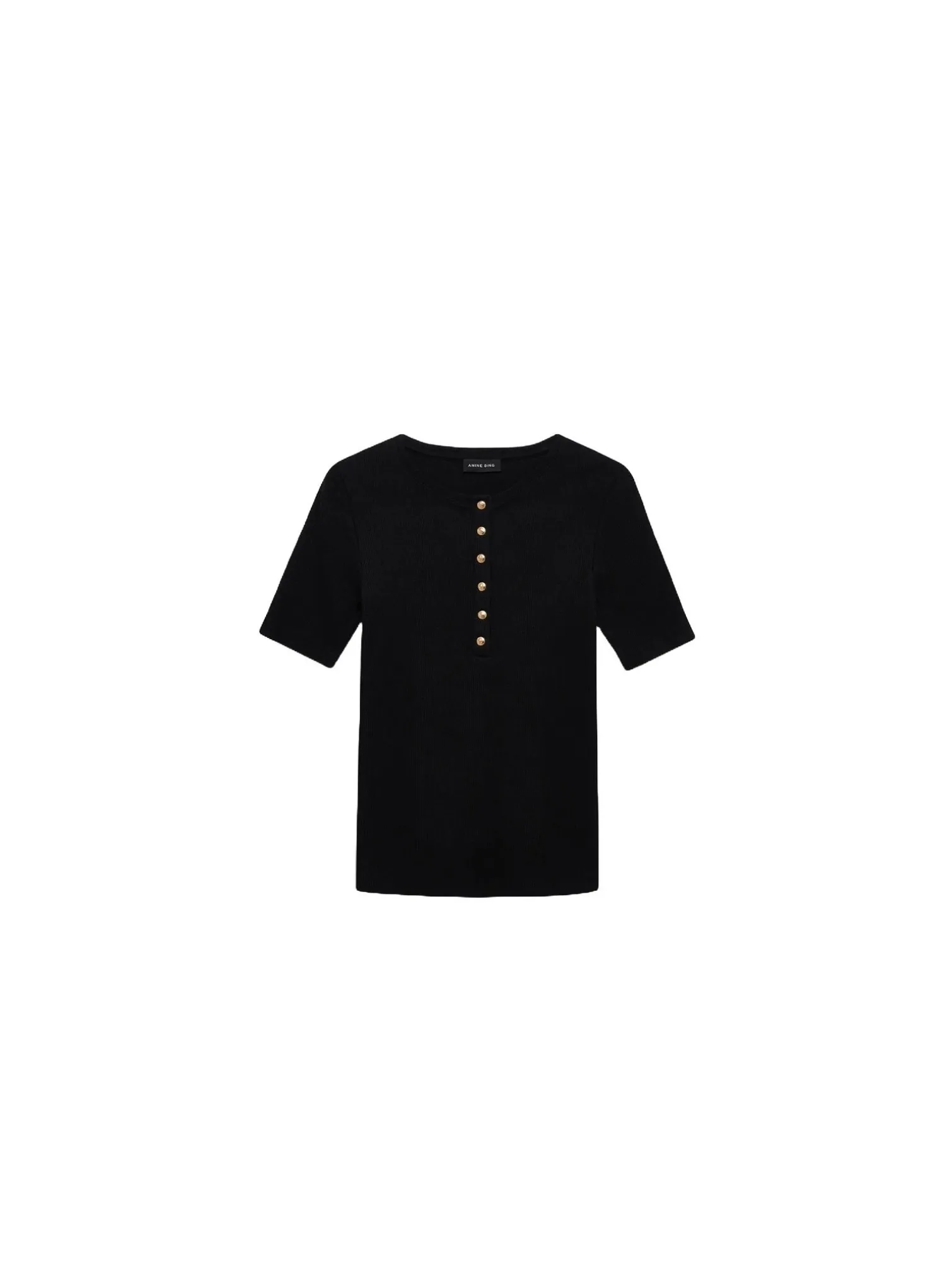 Top Alessia from Anine Bing. Ribbed and stretchy short-sleeved top but gold buttons at the front. Perfect for jeans or suit pants!