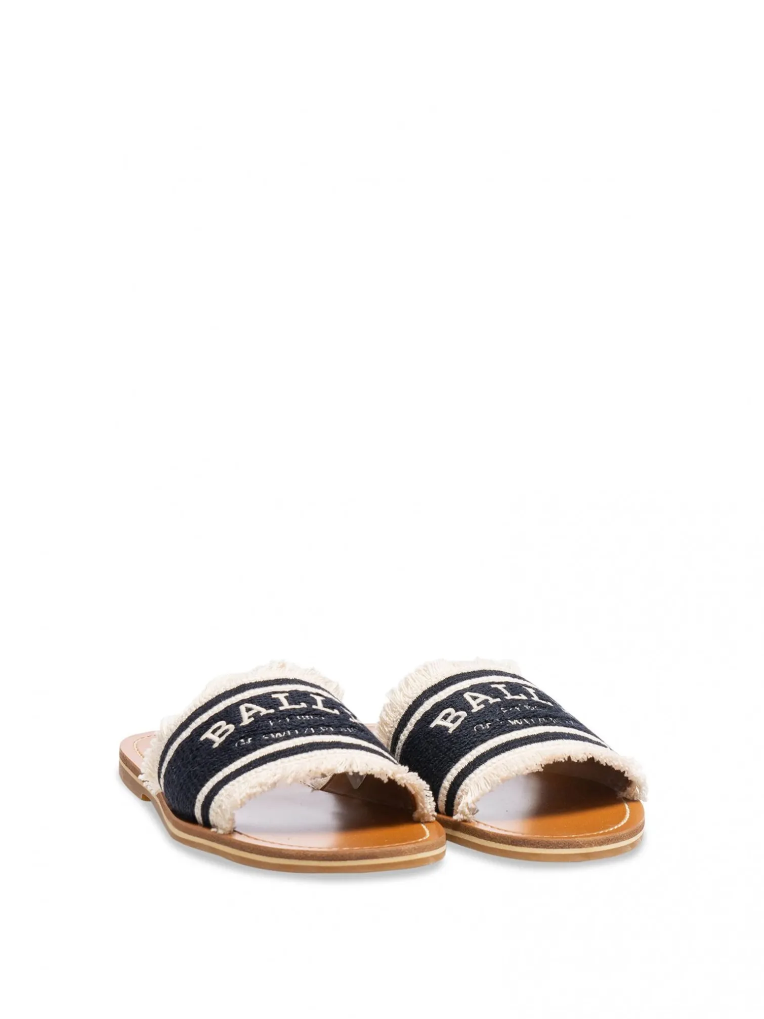 Sandal Bianka from Bally. A pair of luxurious slip-in sandals with an embroided design. Bally logo and a luxurious look with fringes. Sole in leather and rubber.