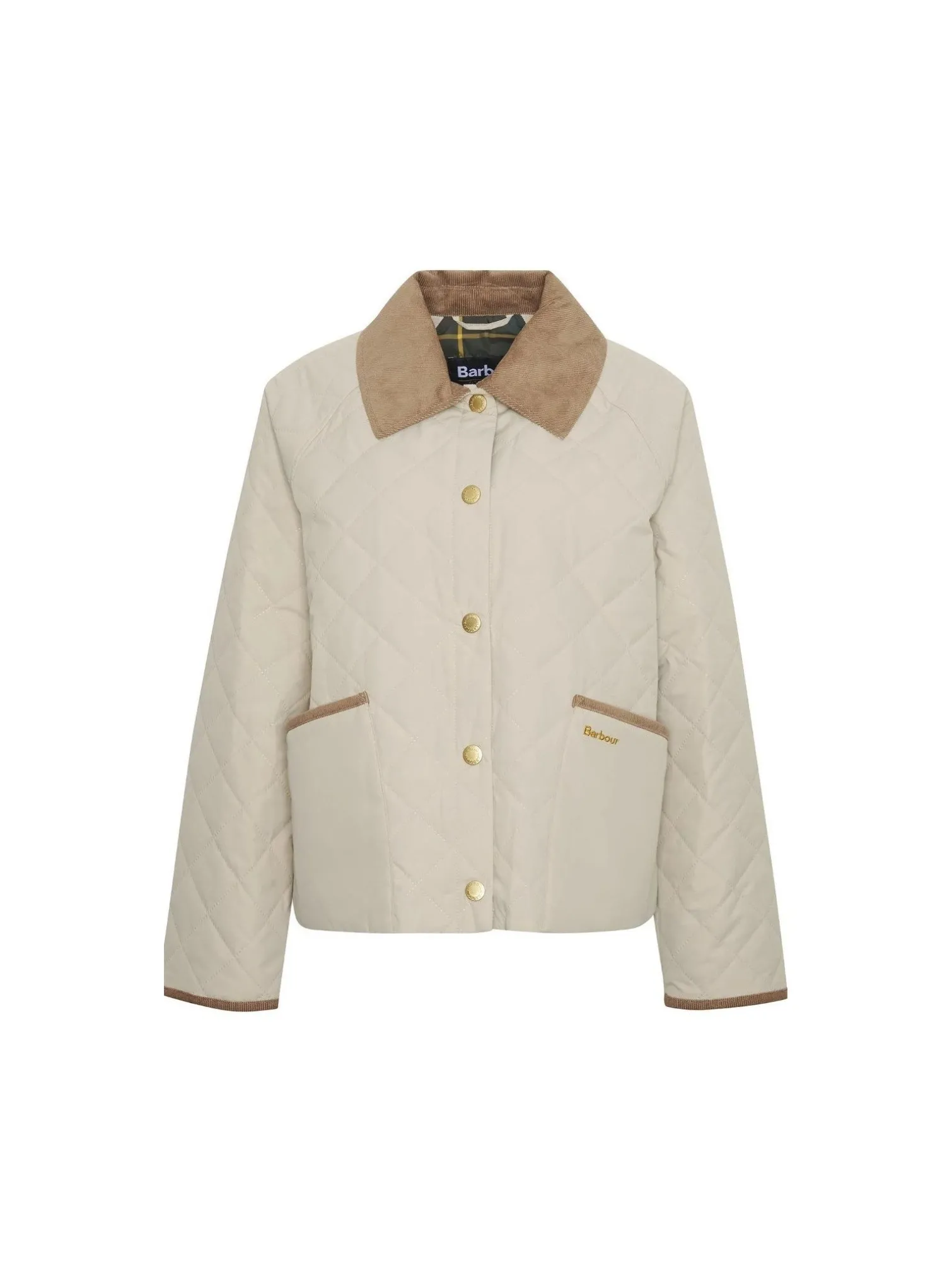 Anise Quilt Jacket from Barbour. A stylish quilted jacket designed with flattering shaped seams, a corduroy collar and fine gold buttons. The jacket has two front pockets, an inner pocket and the Barbour logo on the left pocket.