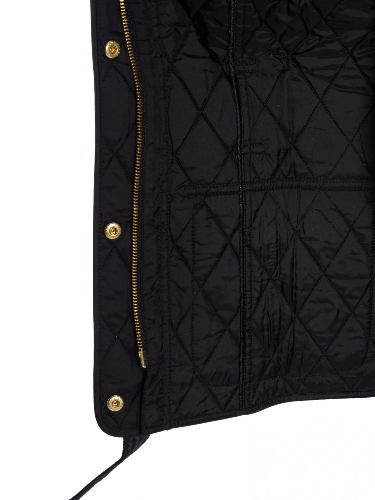 Jacket International Quilt from Barbour. This black jacket has a diamond quilted design with a normal fit. Designed with a belt at the waist that can be adjusted, a funnel collar with a neck strap and a sleeve pocket at the left shoulder. The jacket closes with a two-way zipper that is hidden with snaps. On the front there are four button pockets where one pocket is embroidered with a Barbour mark. A perfect spring jacket that is both stylish and comfortable!