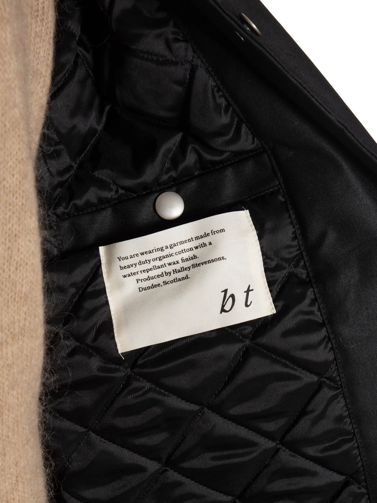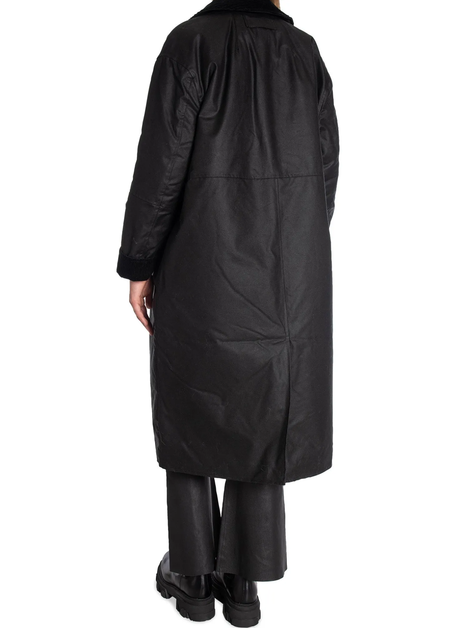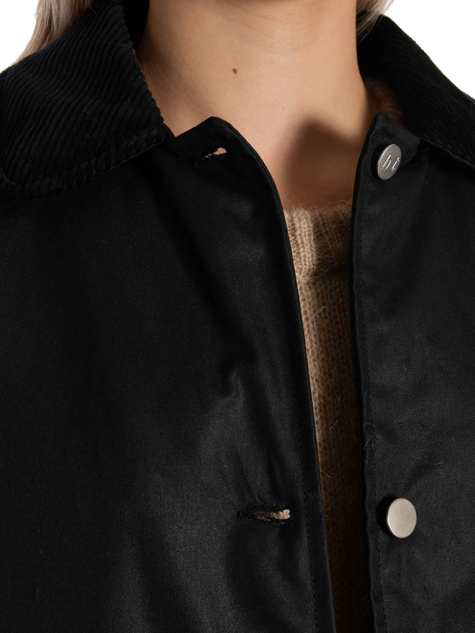 Jacket Joan Jett from Brixtol Textiles. A long oversize coat with a lovely corduroy collar. The fabric is water-repellent thanks to its waxed surface. Closes with buttons and has two pockets with lids and one on the chest.
