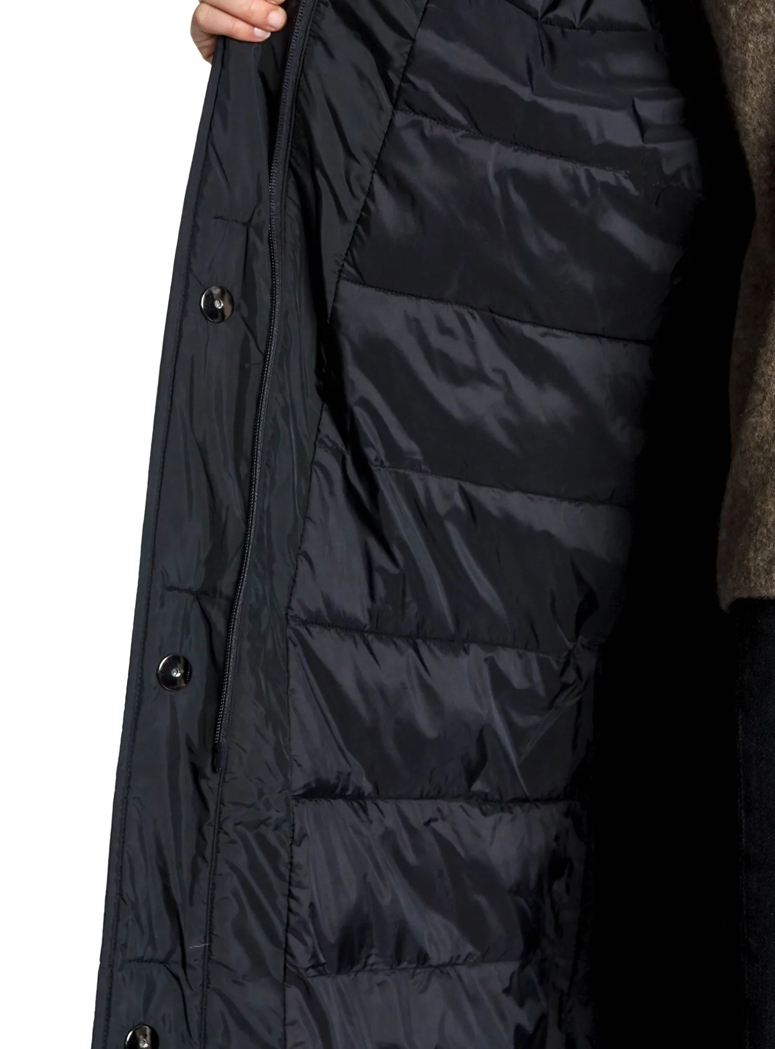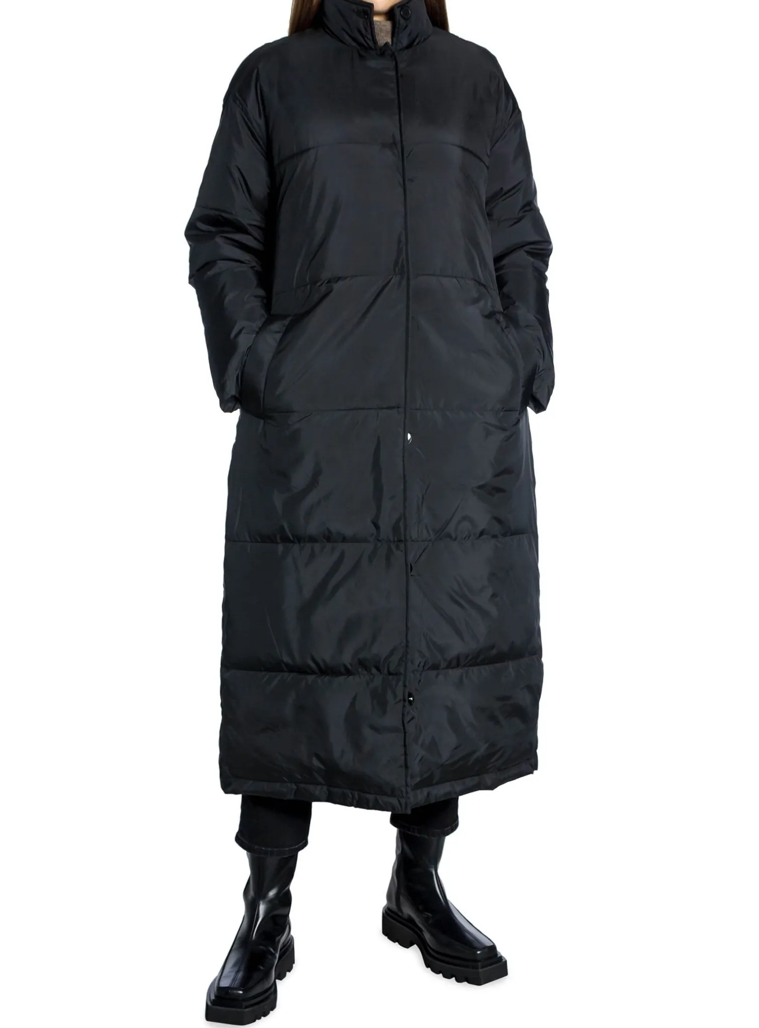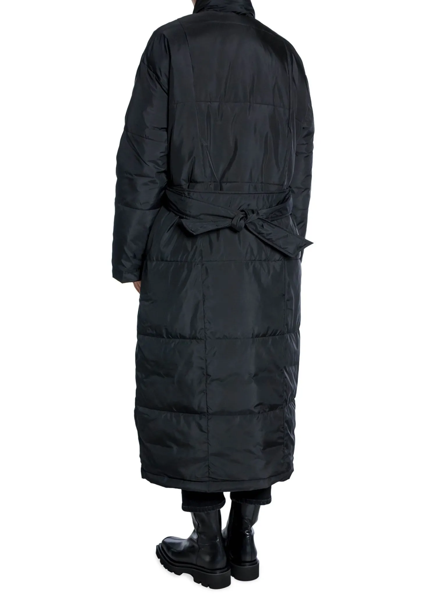 Ana jacket from Brixtol Textiles. Lightweight puffer coat in an oversized design that falls below above the ankle and features spacious welt pockets at the sides. Styled with a high neck and discreet press buttons, and a belt at waist for added shape. Developed in a recycled polyester quality made out of post-consumer textile waste certified by GRS. The shell fabric is sewn in a horizontal quilting pattern and treated with a PFAS-free light water repellent treatment.