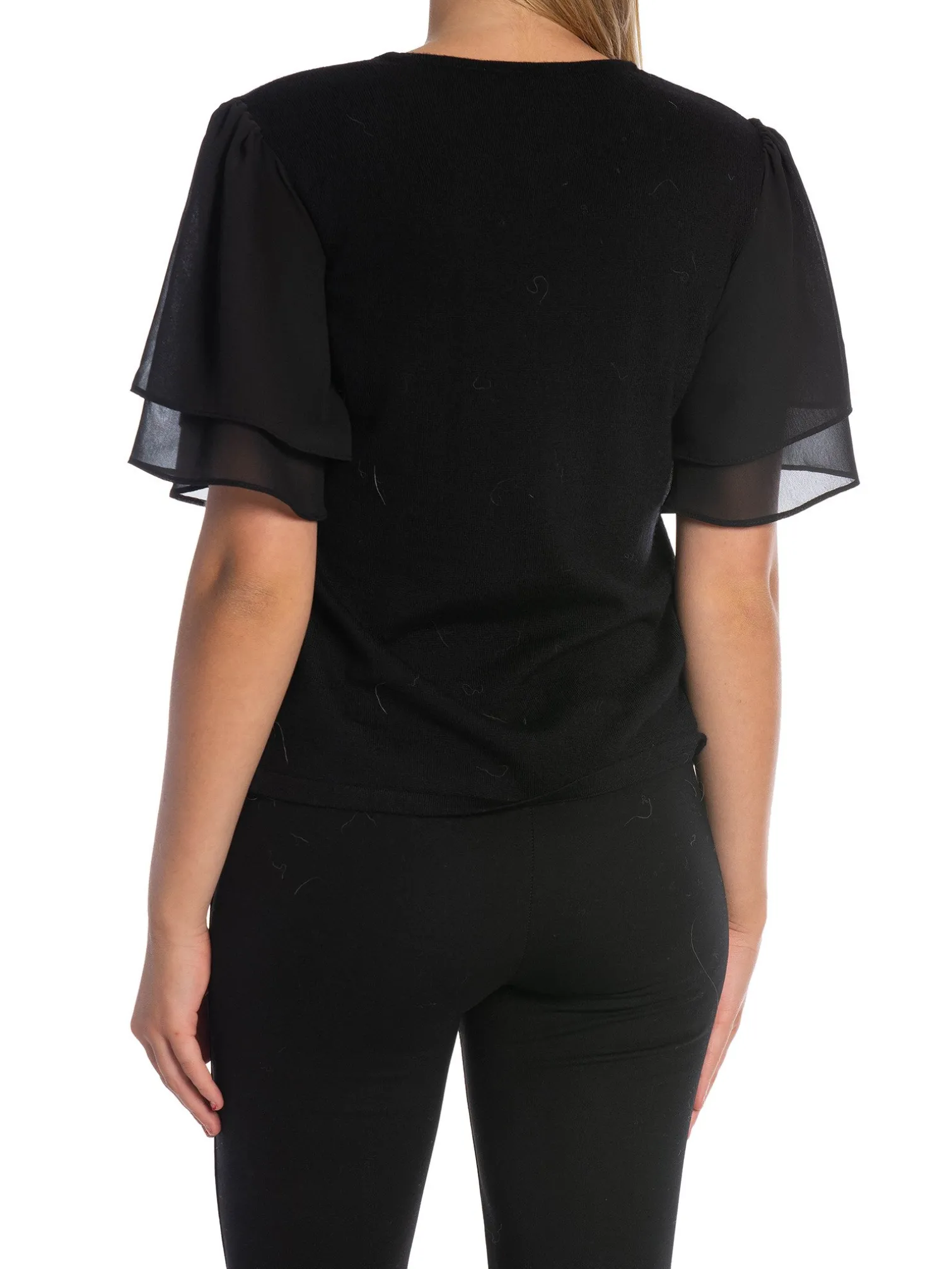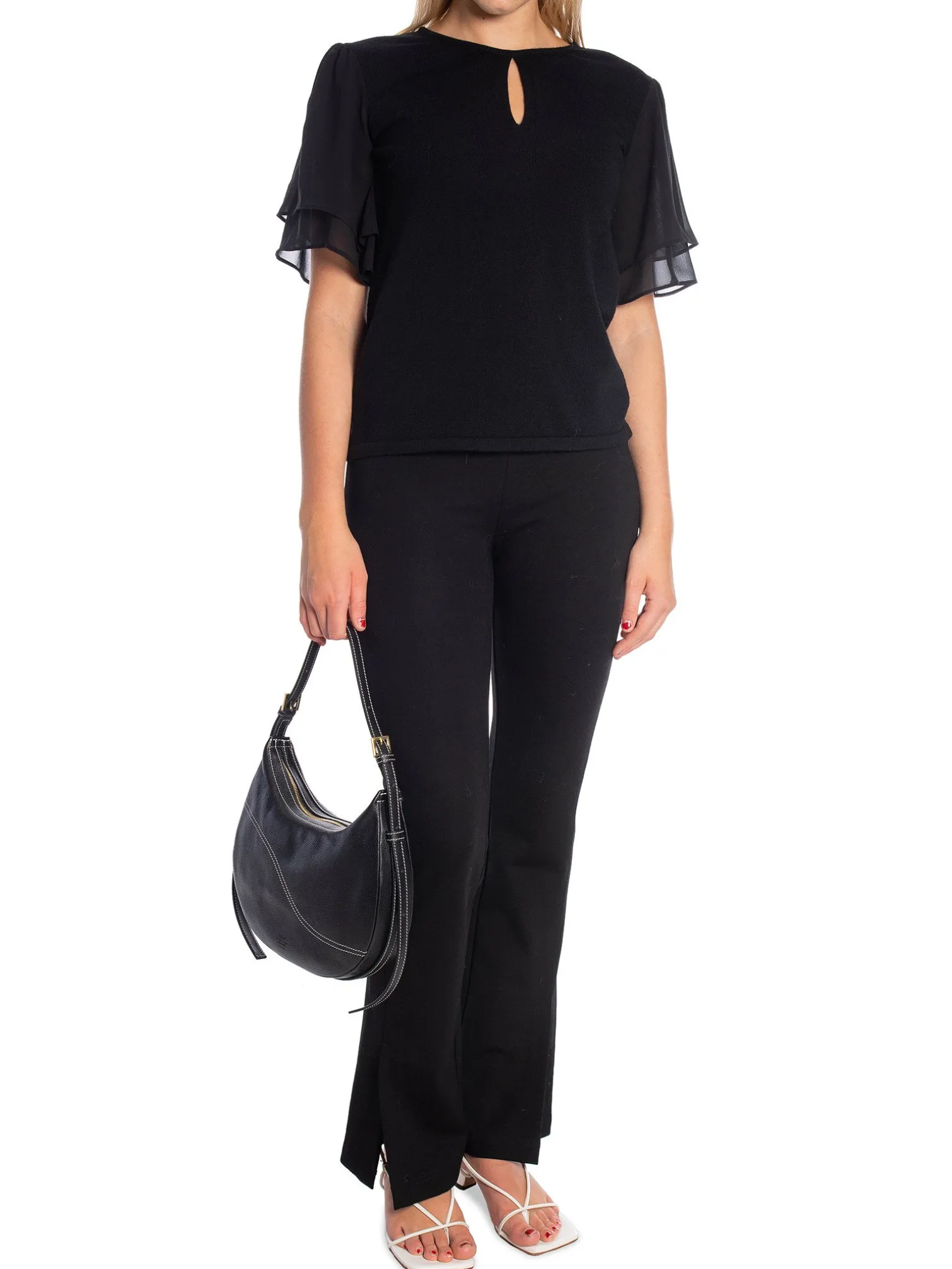 Top Daniella from Busnel. A cute top in soft merino wool with contrasting ruffle sleeves in slightly transparent fabric. A cute and warming top perfect to wear with your suit pants!