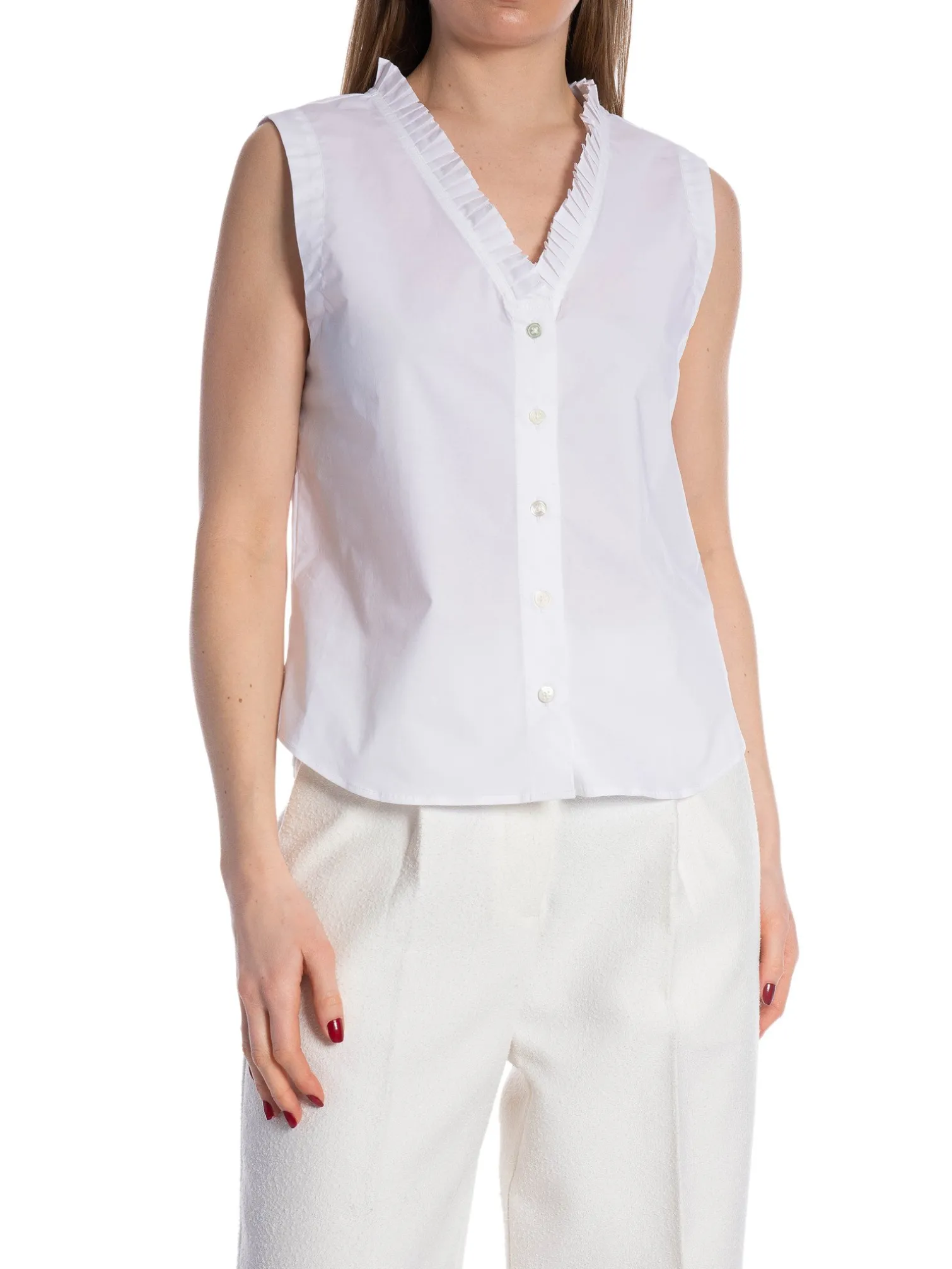 Top Nilly from Busnel. Made from a stretchy cotton poplin fabric. The sleeveless top has a pleated detail along the v-neck, small side slits and matching buttons at the front. The pleated details around the neck make it the perfect top to wear on its own or under a jacket or blazer.