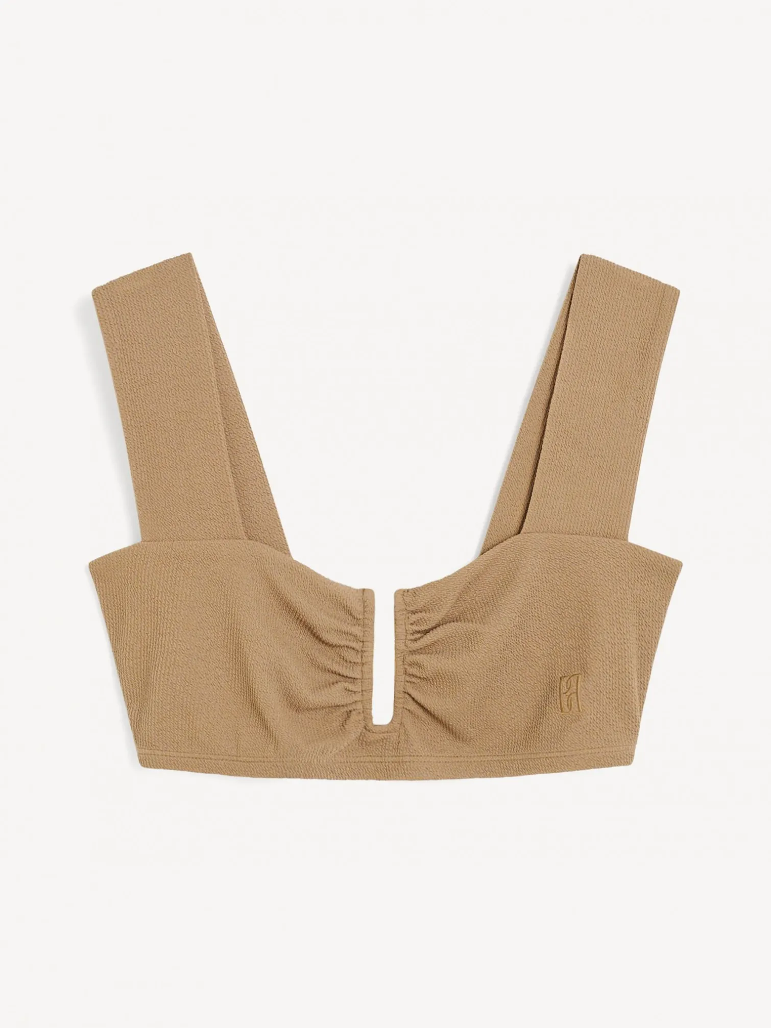 Bikini top Belira from By Malene Birger. A beautiful brown bikini top with an embroidered logo. Designed with wide shoulder straps. Wear with matching bikini bottom