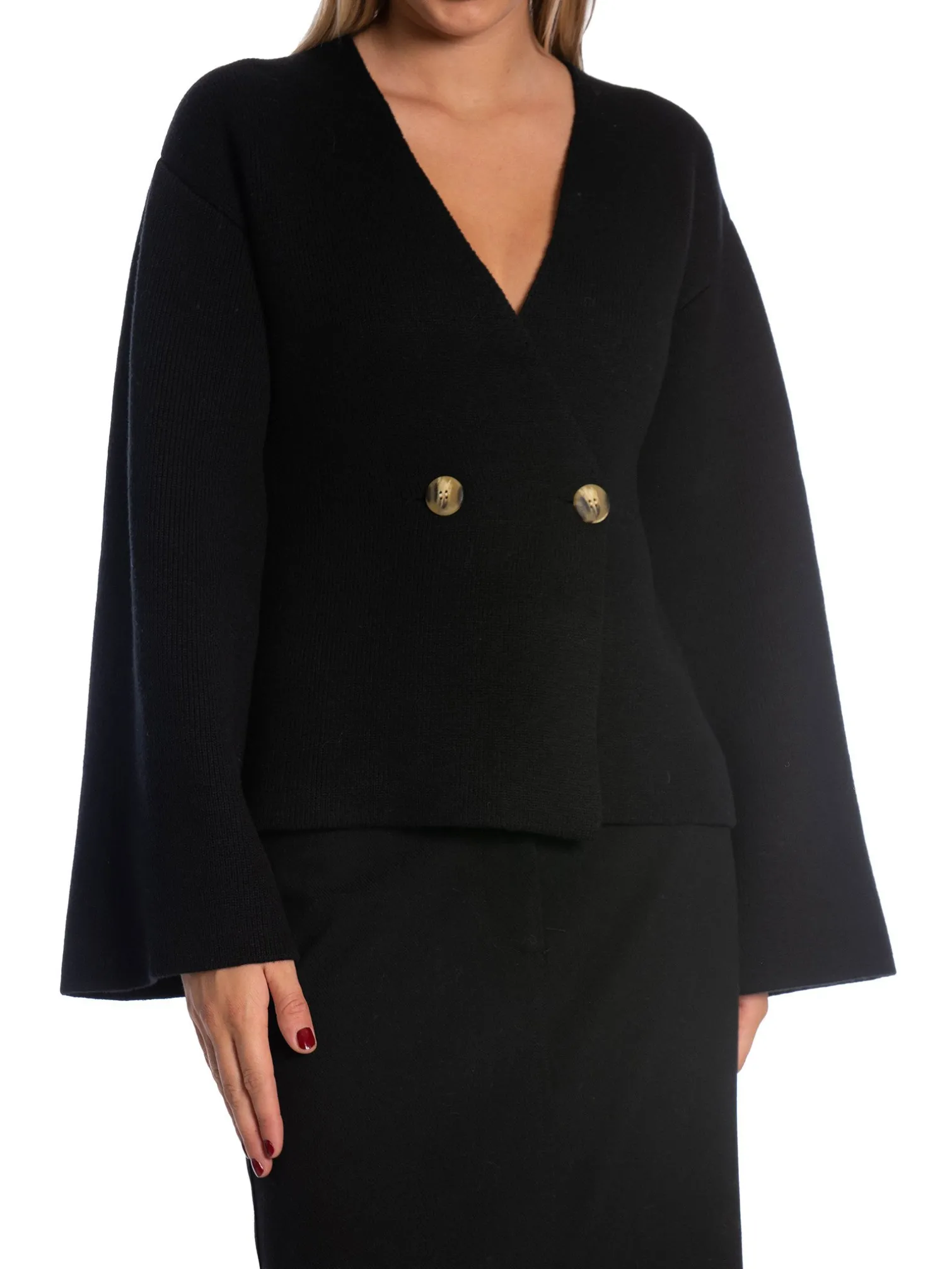 Cardigan Tinley from By Malene Birger. The cardigan is spun from a blend of wool and mohair with a sense of stretch for comfort and flexibility.The Tinley cardigan defines the waist with a cut-out and double-breasted buttons that create a flattering silhouette. It is designed with generous sleeves and a deep V-neck that creates its relaxed feel. Style with suit pants!