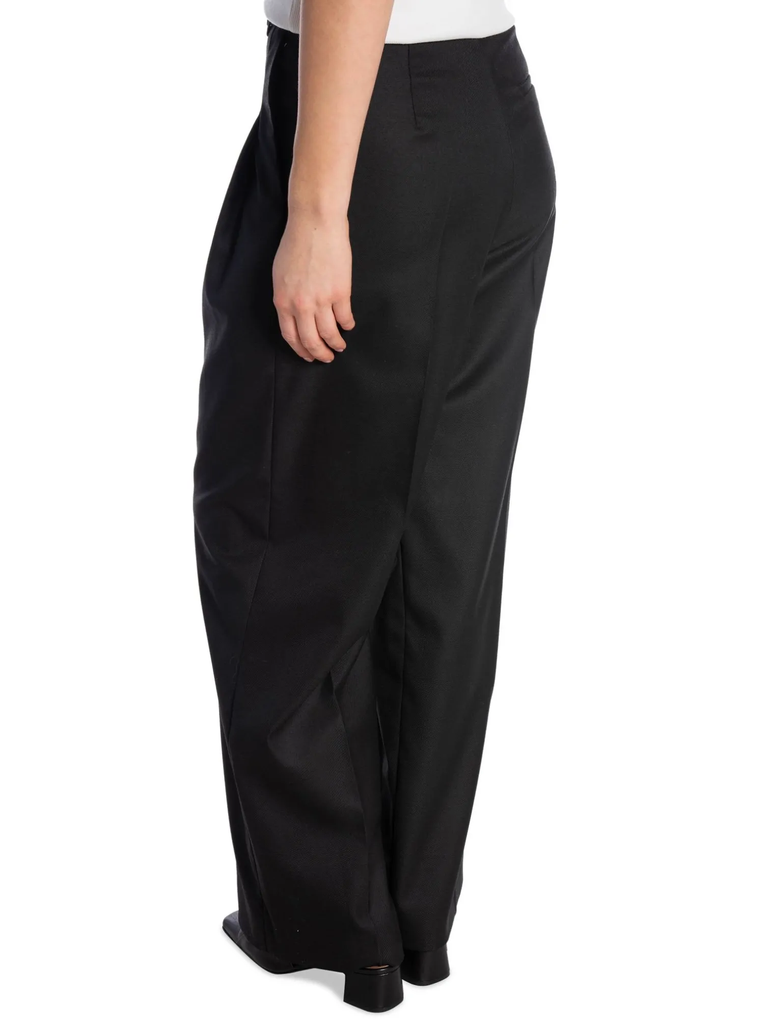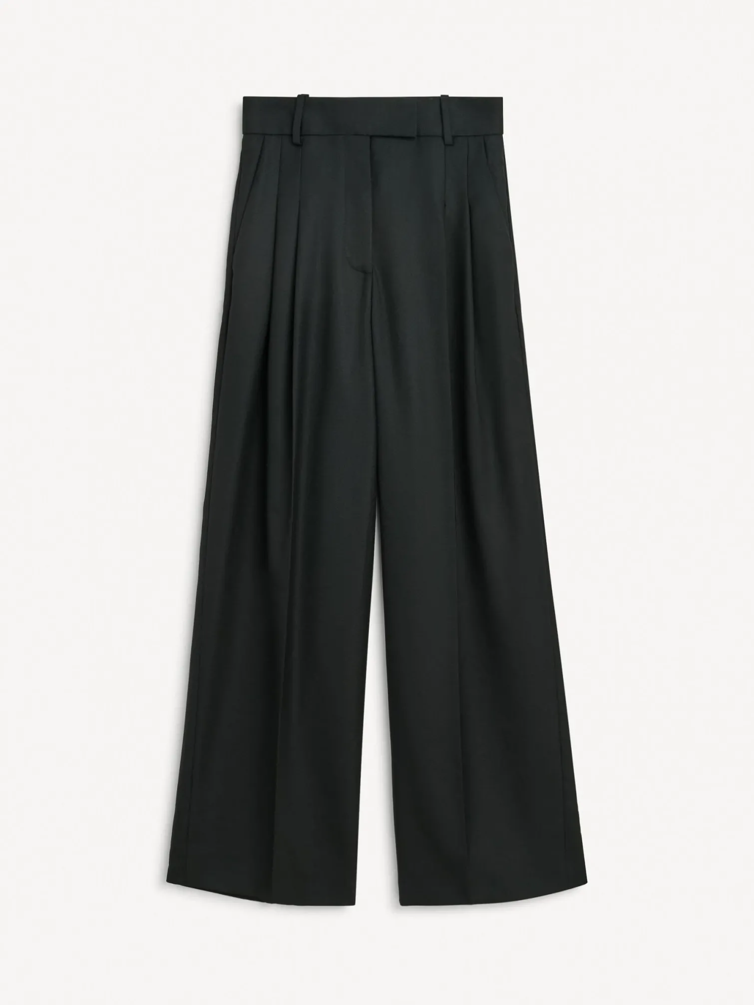 Cymbaria trousers from by Malene Birger. Wide suit trousers with a high waist and sewn pleats at the front. Style with a white shirt tucked in!