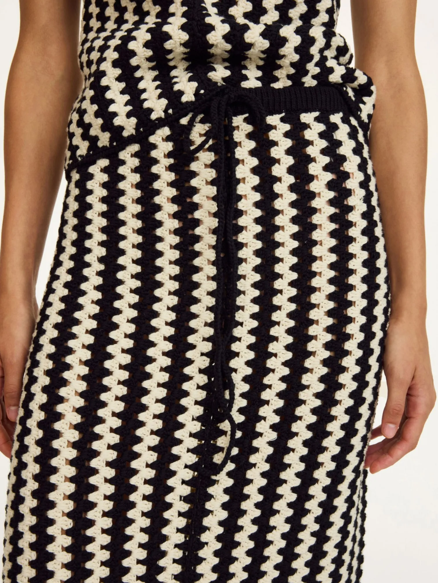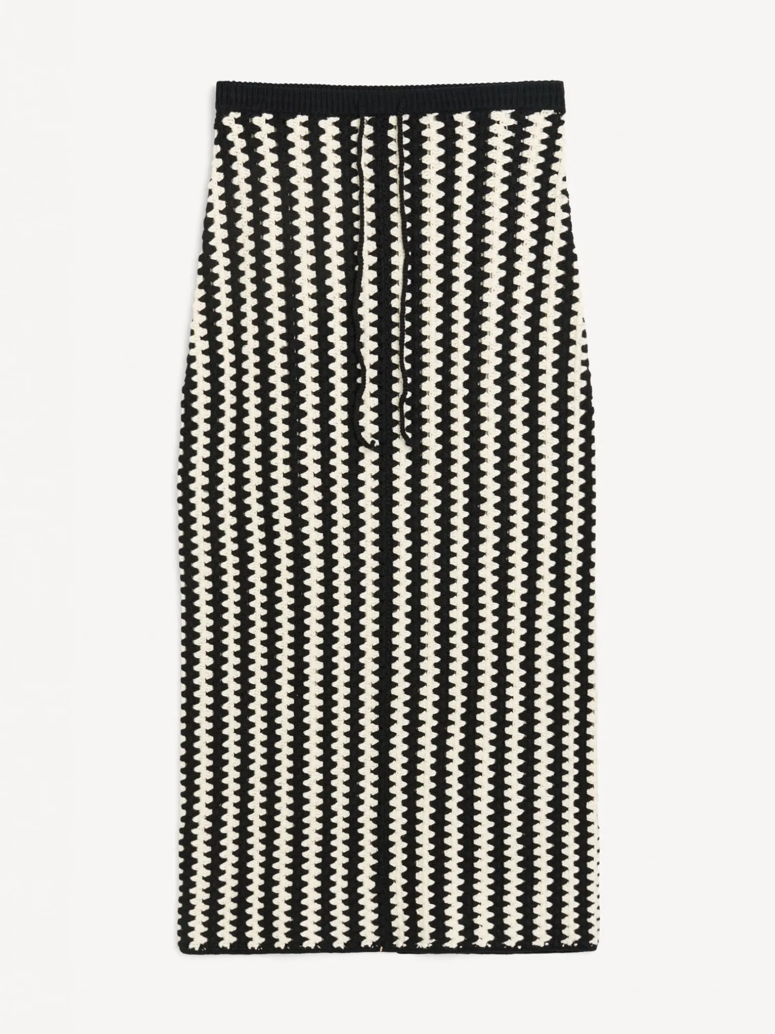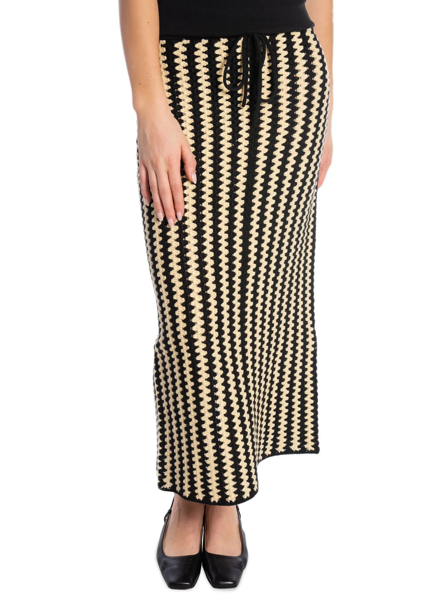 Skirt Raze from By Malene Birger. A super nice crochet skirt with a bohemian pattern and stretchy elastic at the waist. The skirt has a nice fall and long fit and a slit at the back. Style with a white t-shirt for a nicer everyday look!