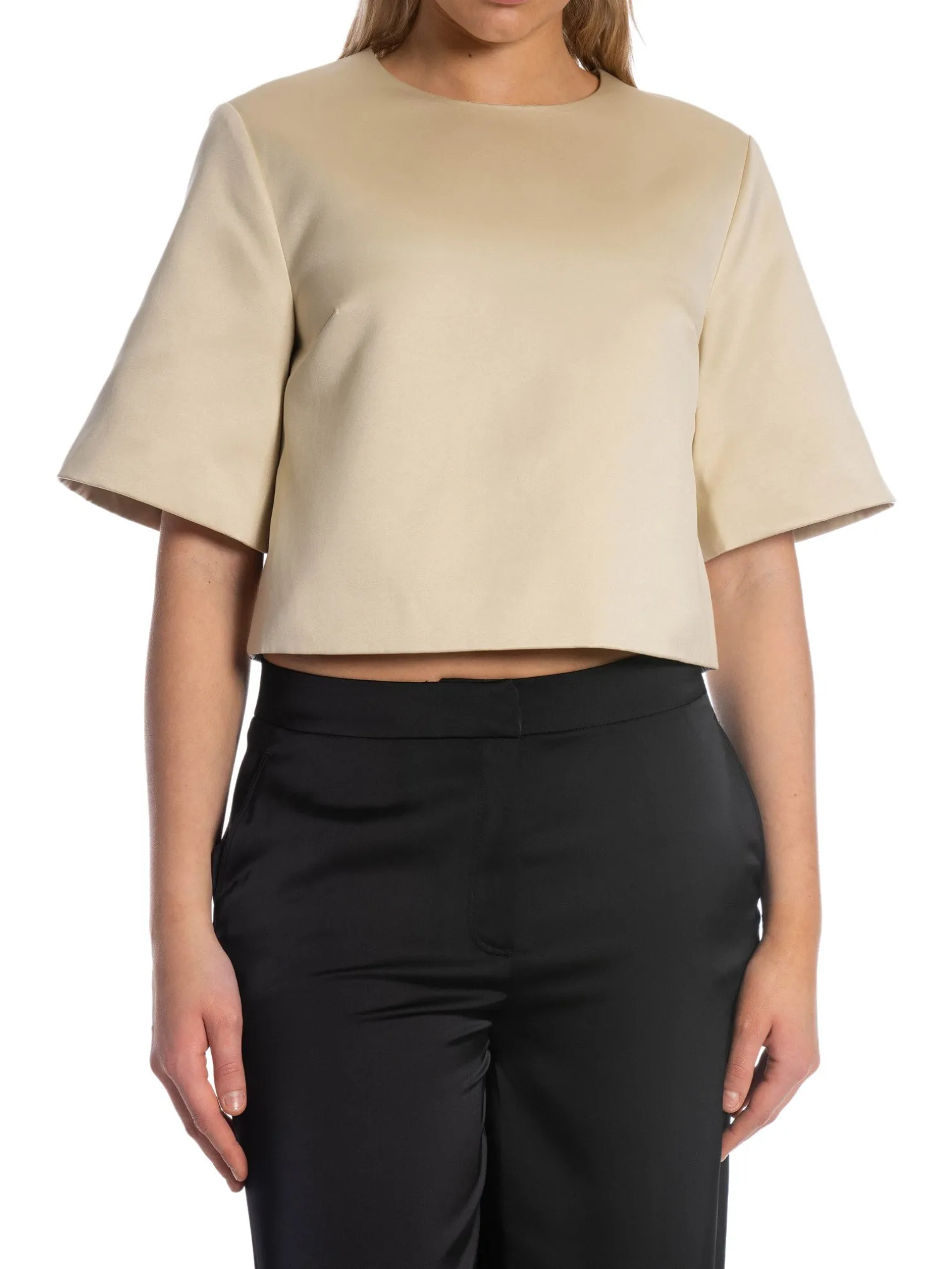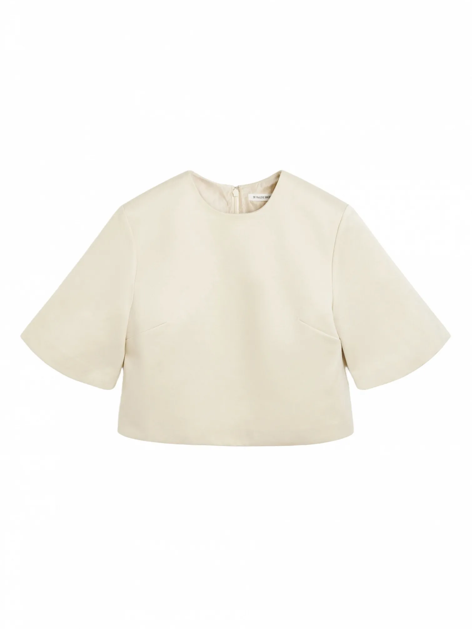 Top Hania from By Malene Birger. This stylish top is timeless in silhouette and fits perfectly all year round. The slightly cropped t-shirt silhouette closes with a zipper and hook in the back.