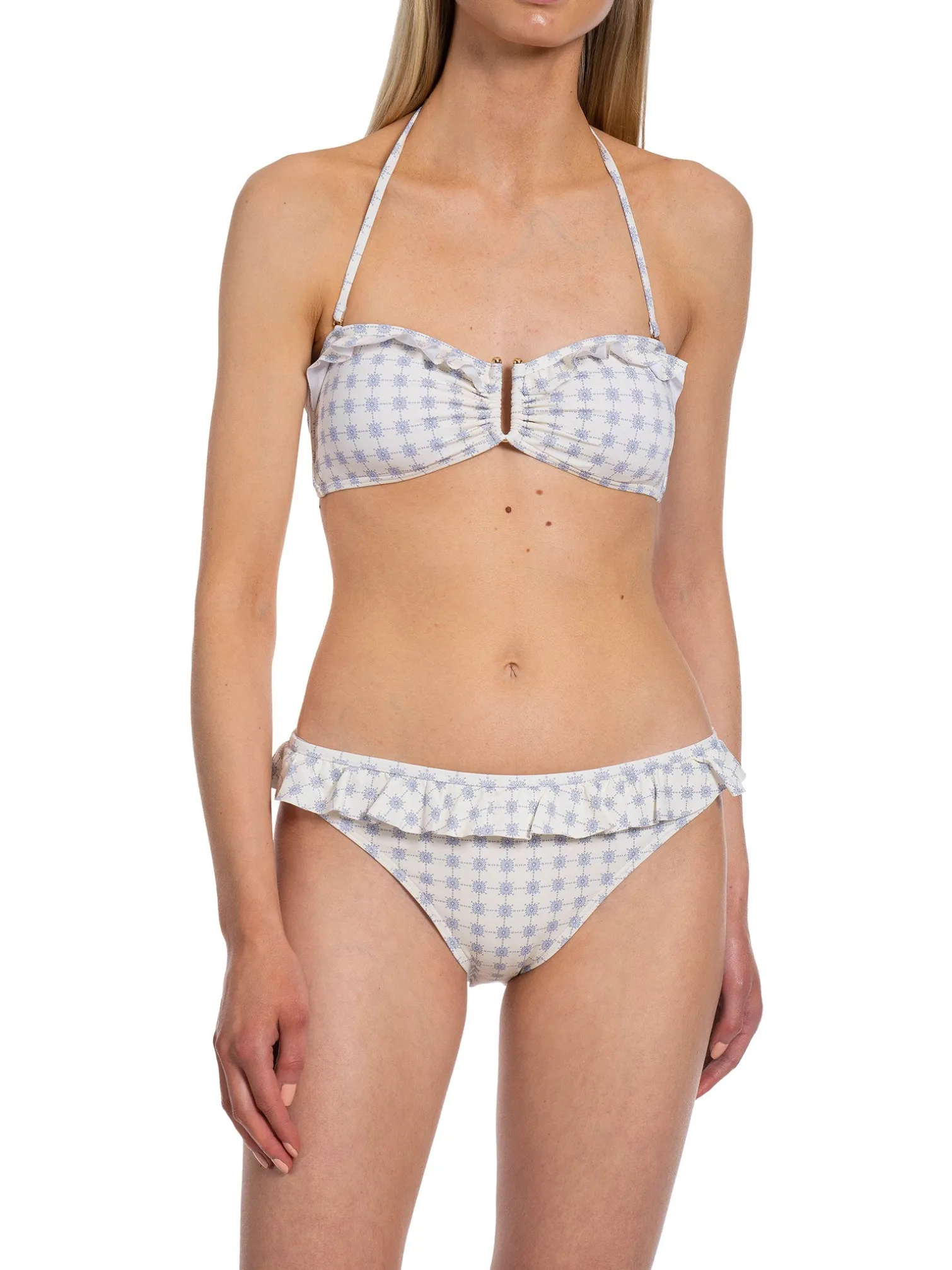 Bikini top Coraline from By Malina. A romantic bkini top with a blue pattern. The top is padded and has optional shoulder straps. Comes with a storage bag.