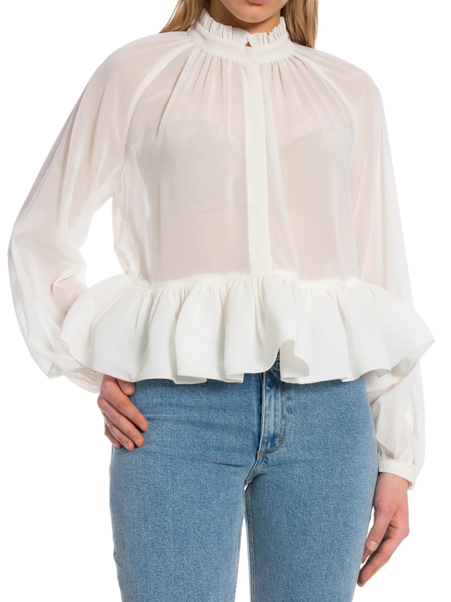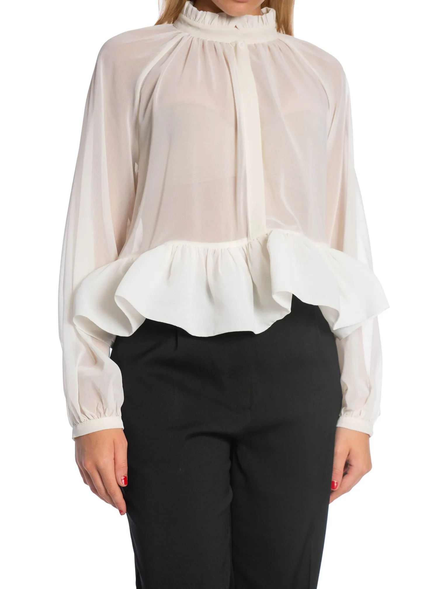 Blouse Alva Frill from By Malina. A nice cropped blouse in a transparent material. The blouse has long sleeves with frill details. Concealed buttons at the front. Style with a pair of suit trousers for an elegant look.