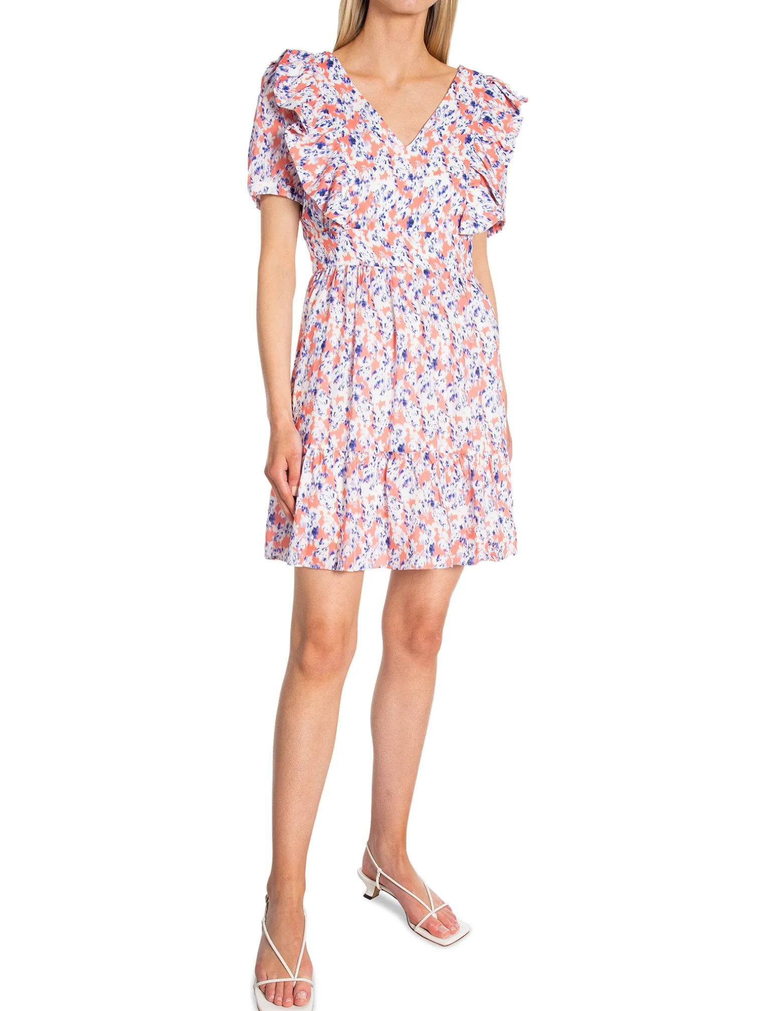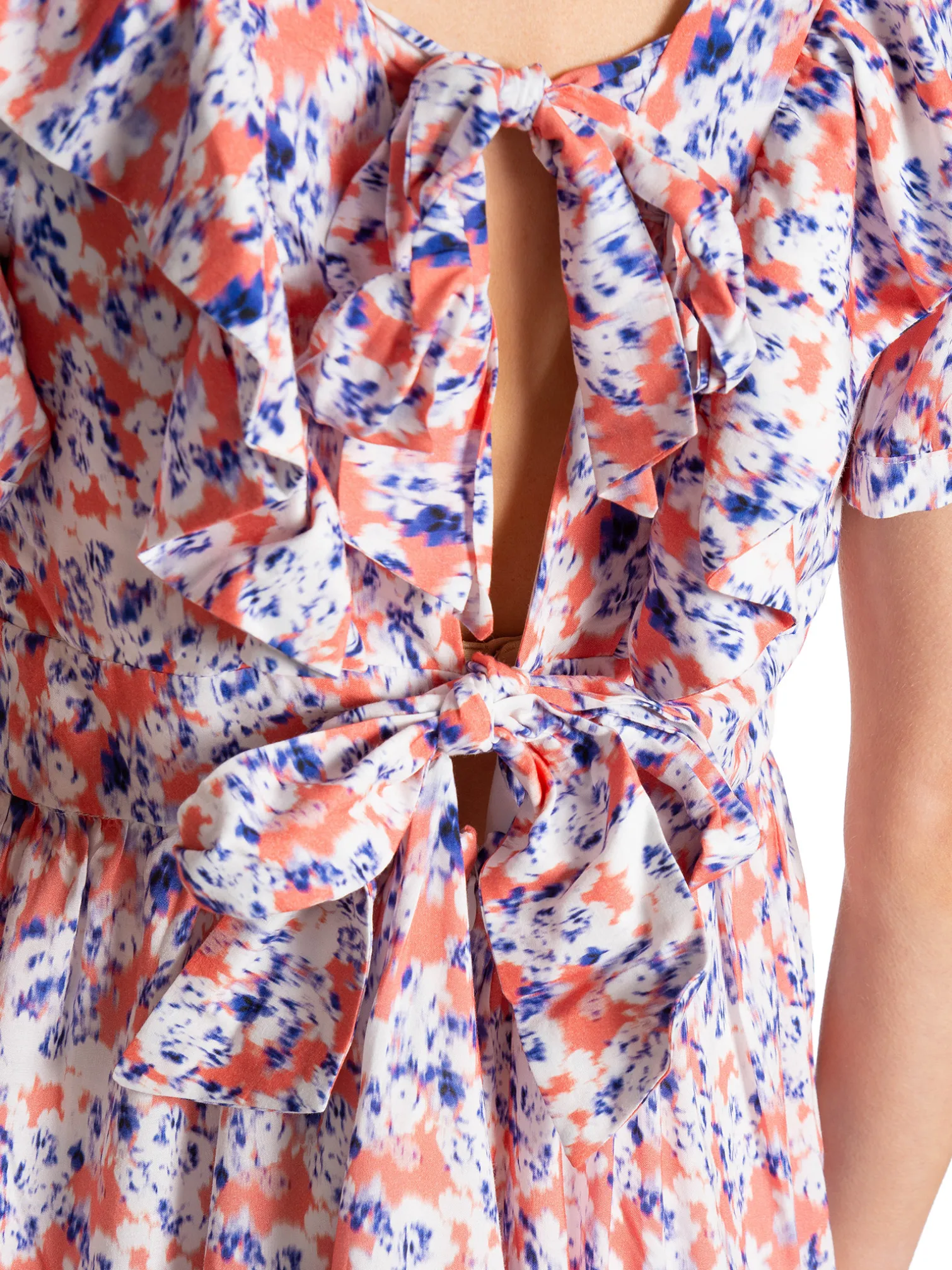 Dress Aurelia from By Malina. The dress has ties in the back and a V-neckline both in the front and back. Designed in a lovley summer pattern. Wear with a pair of sandels.