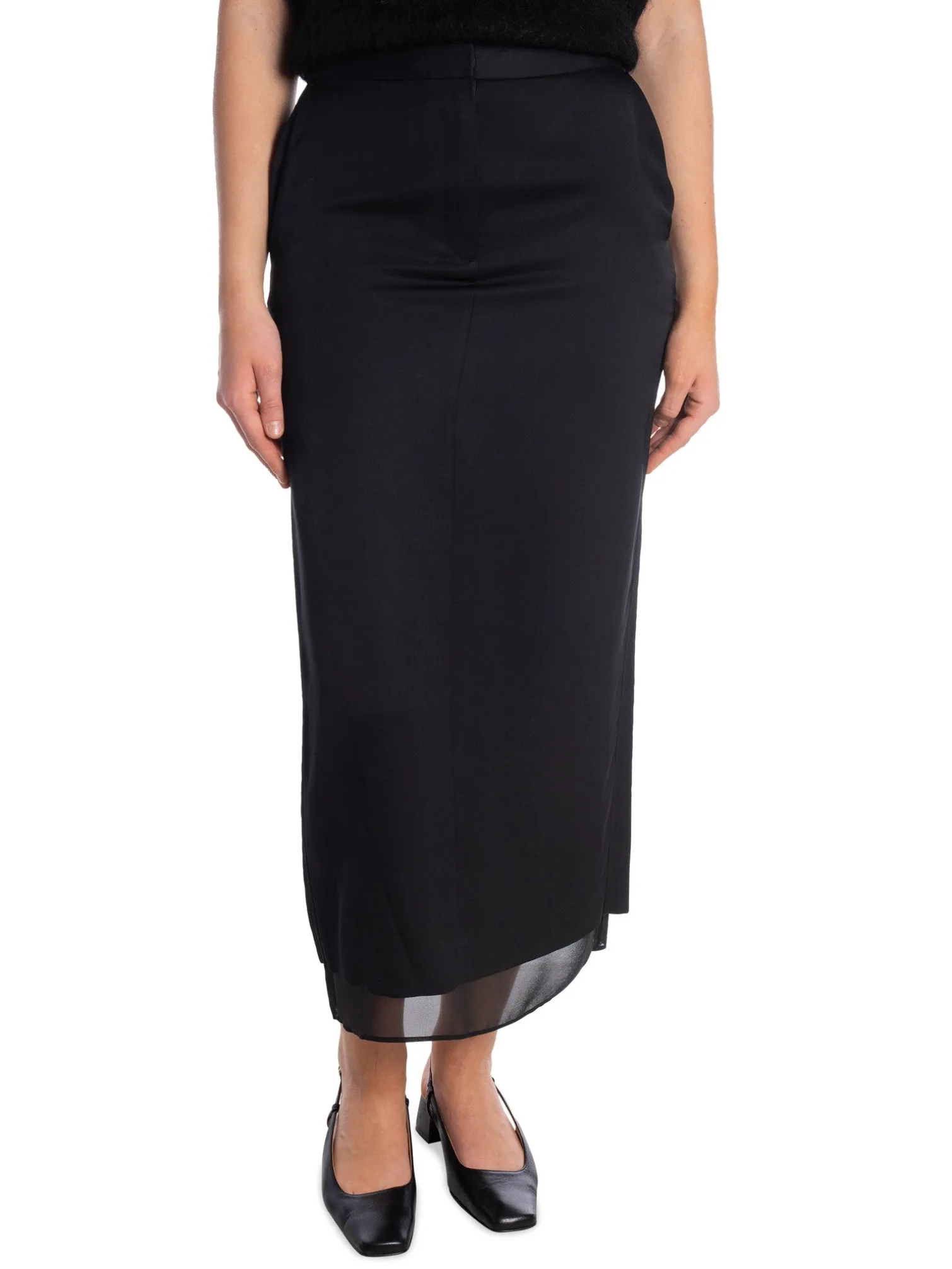 Skirt Sheer Panel Layer Ankle from Calvin Klein. A wide satin skirt with a modern double hem, in mesh material with a slit at the back. Designed with two side pockets and a mock pocket at the back. Closes with a hook and zipper at the front. Style together with a white shirt for a modern look!