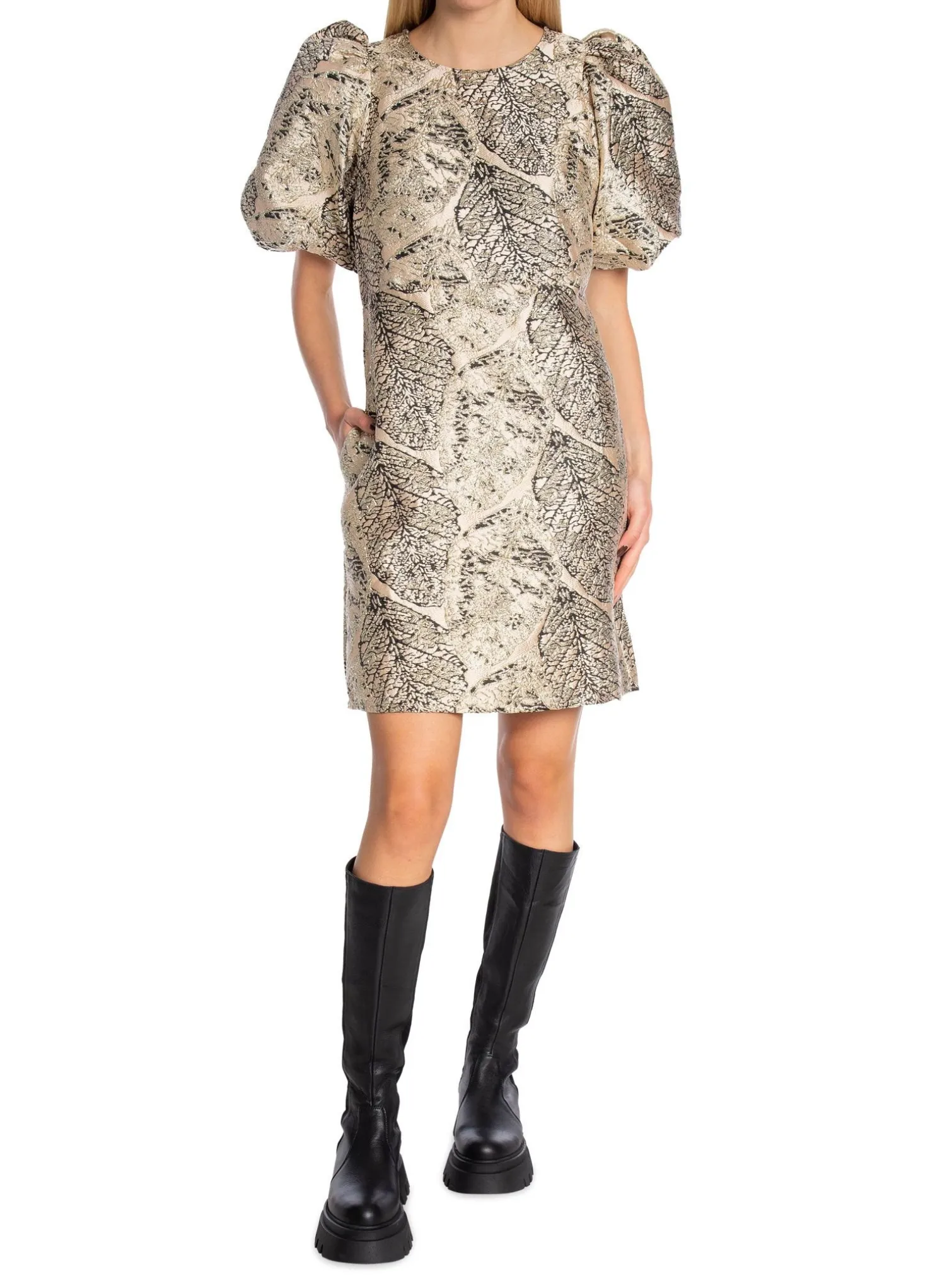 Dress Gina Jacquard from Co¨Couture. A knee-length jacquard dress in shifting shades of beige, gold and black. The dress closes with a hidden zipper. Decorative puffed sleeves that give the dress more life. Fully lined with side pockets. Style it with a pair of knee-high boots and a blazer for a festive look!