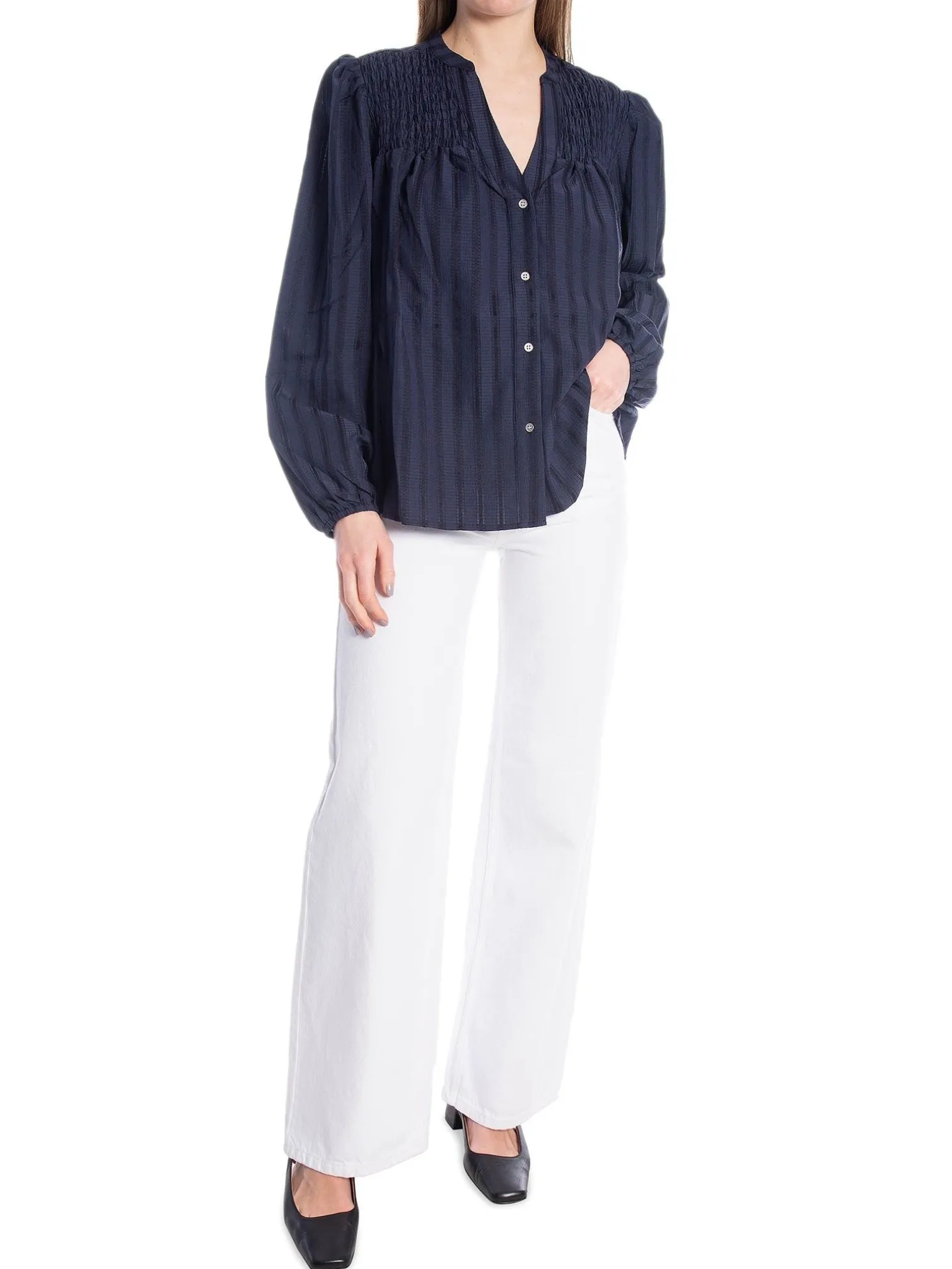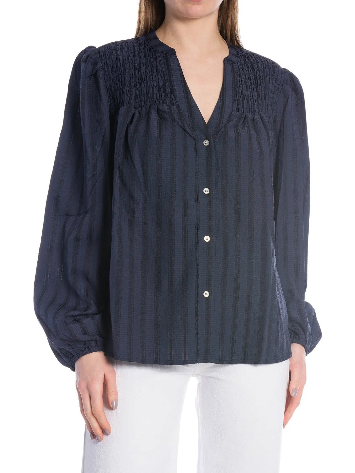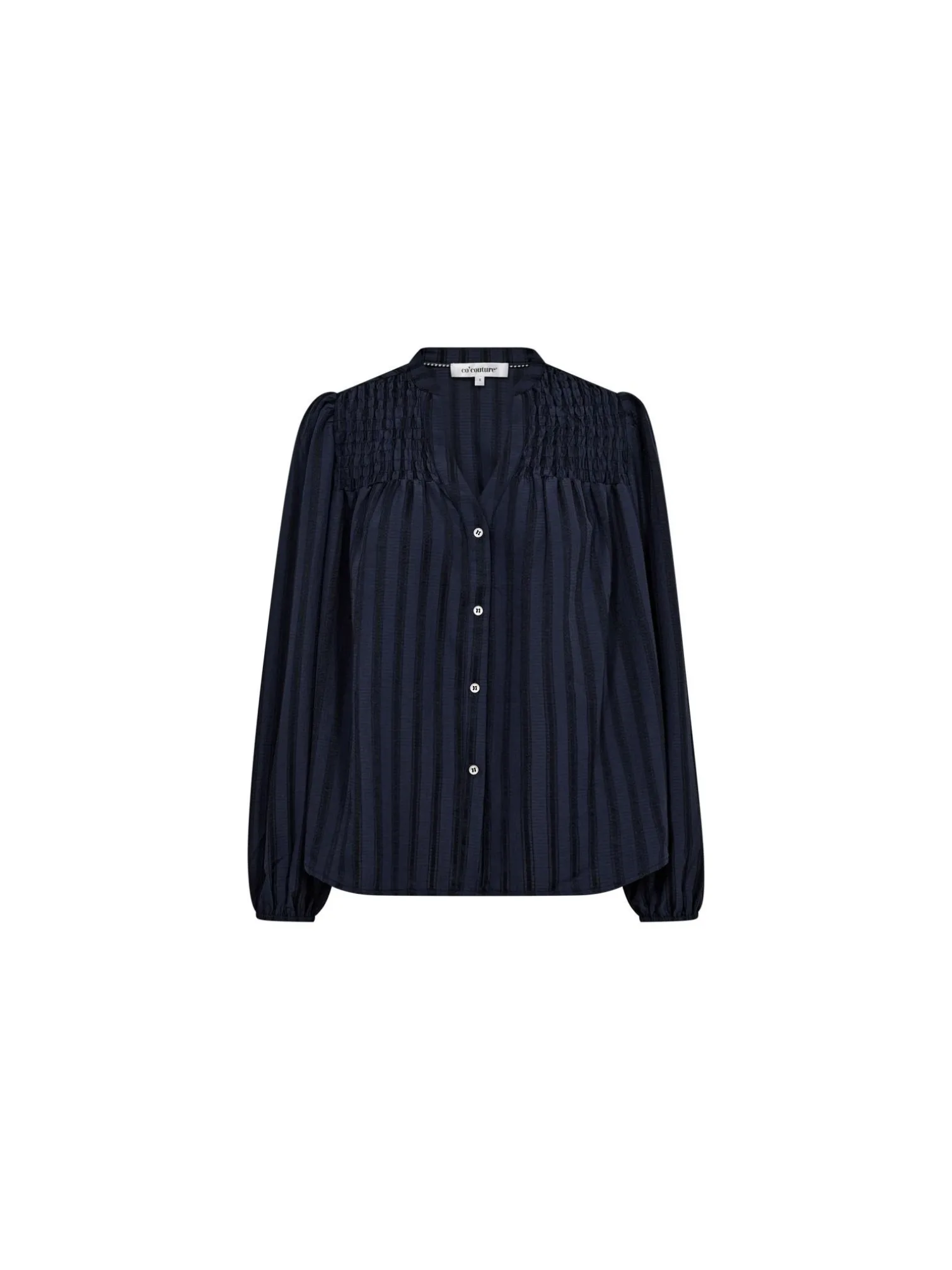 Blouse Lulu from Co’couture. Elegant striped shirt with loose fit from Co’couture with fine smocking details. With v-neckline and button closure.