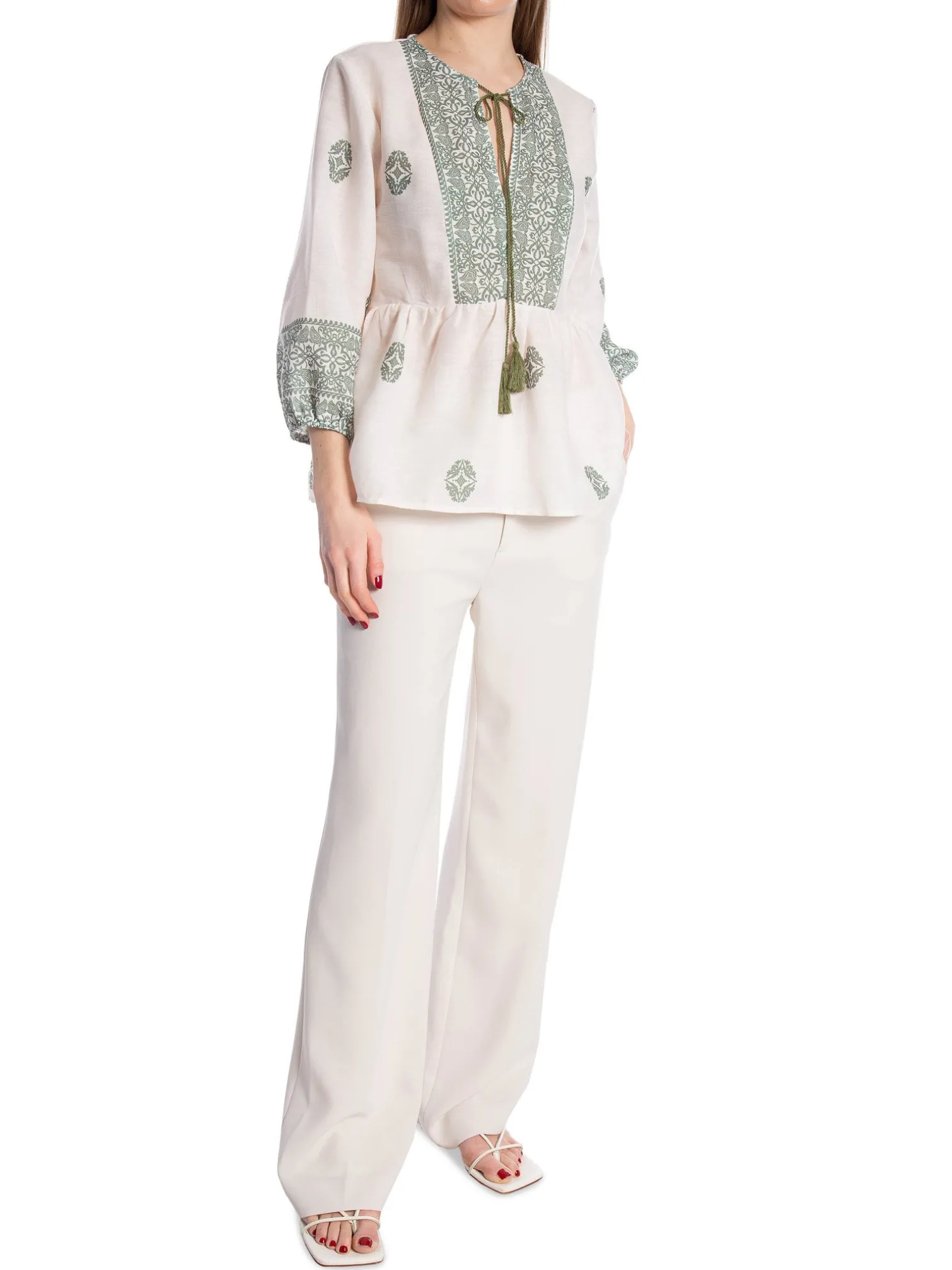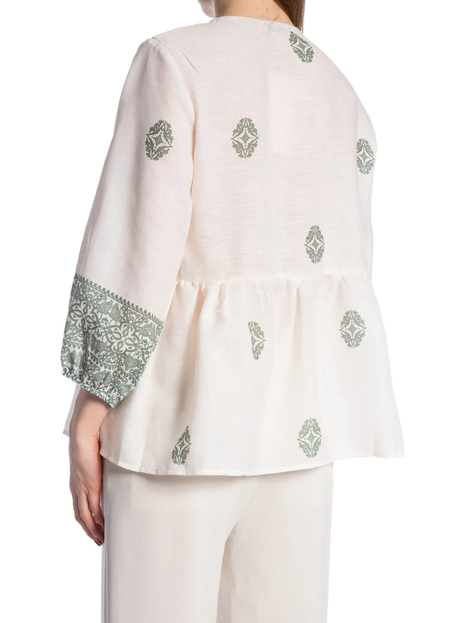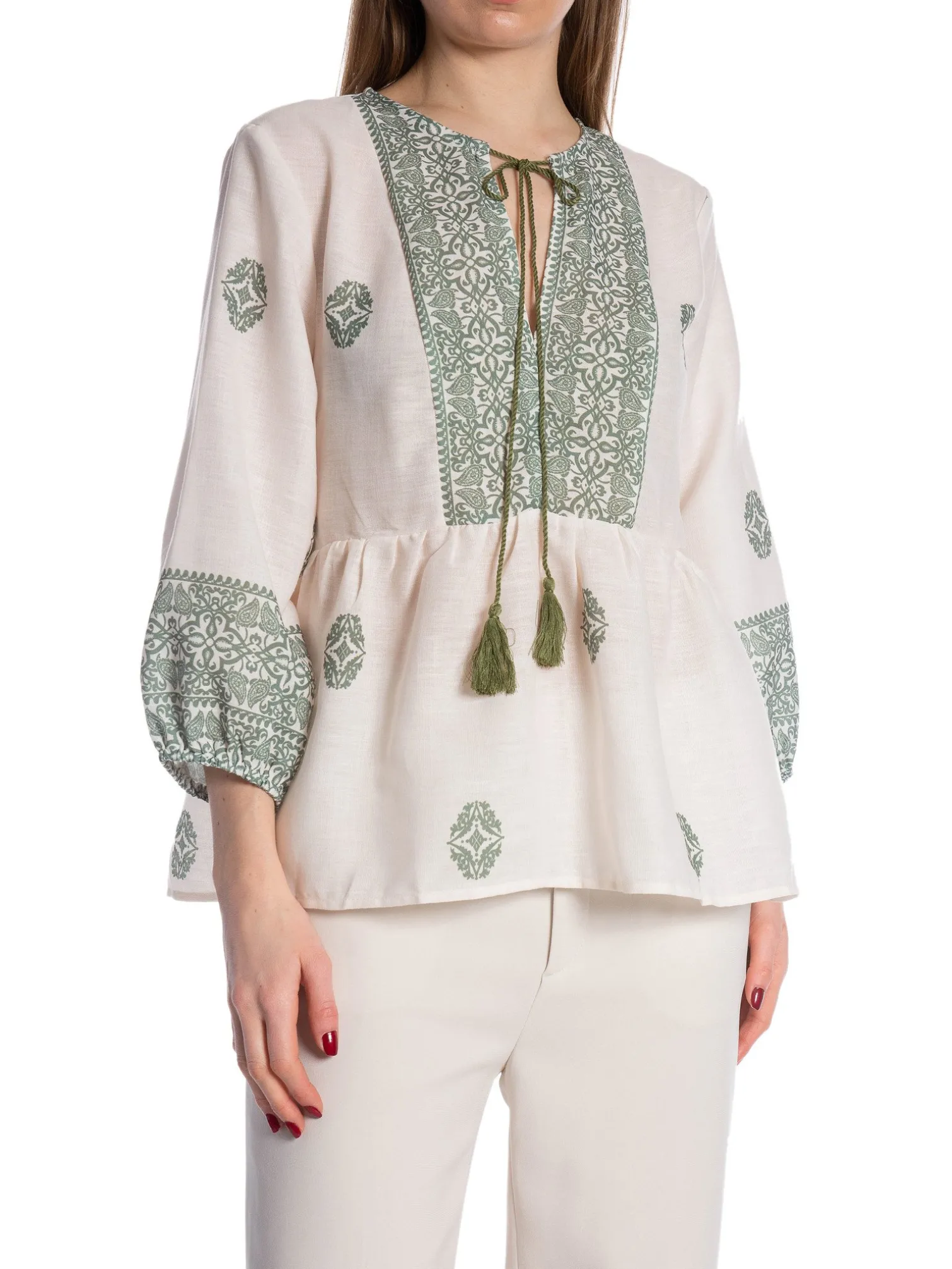 Blouse Bohemian Loose Sleeves from Copperose. Bohemian blouse with pattern and tie at the front. Slightly shorter balloon sleeves and ruffle from the waist.