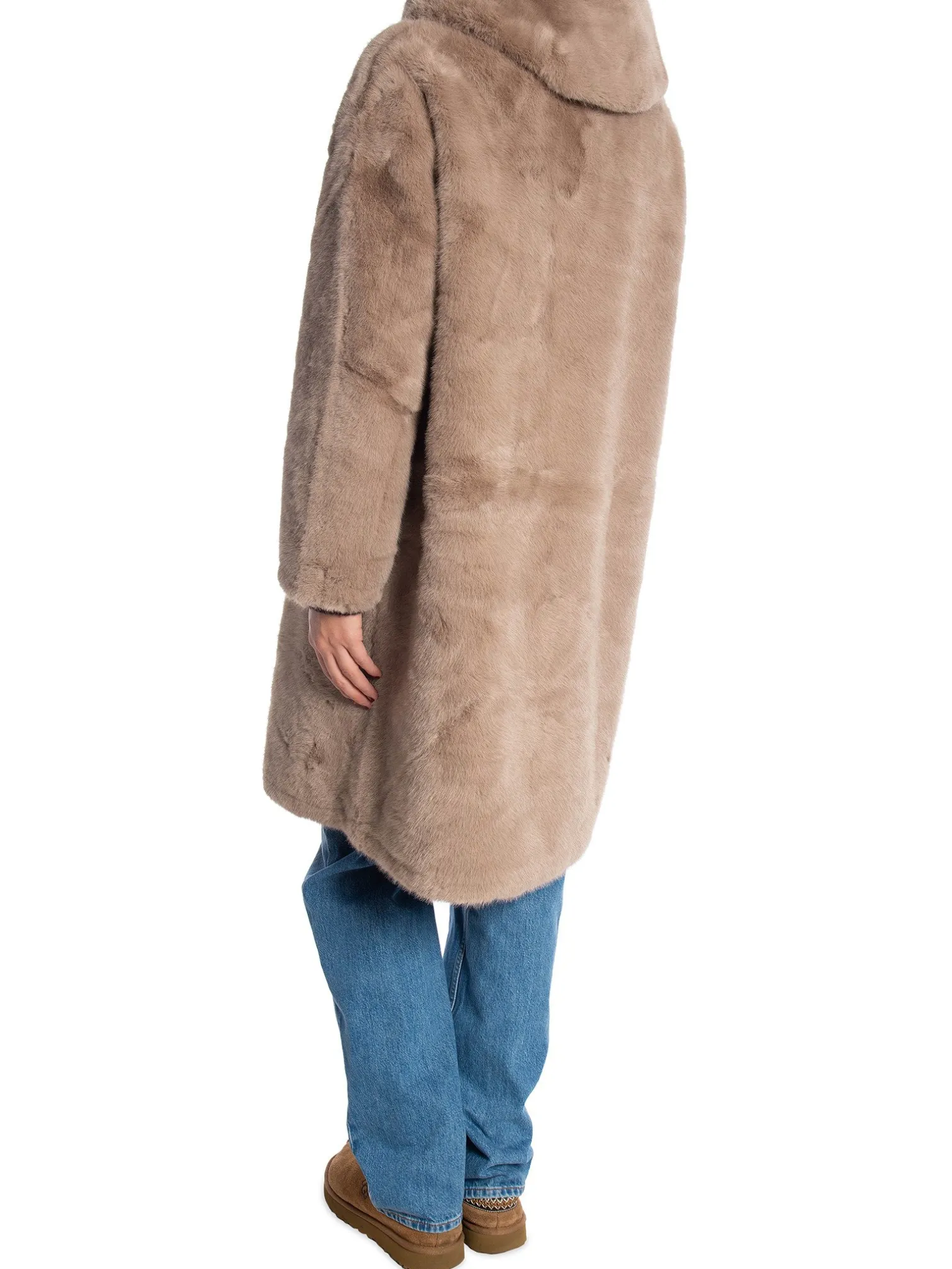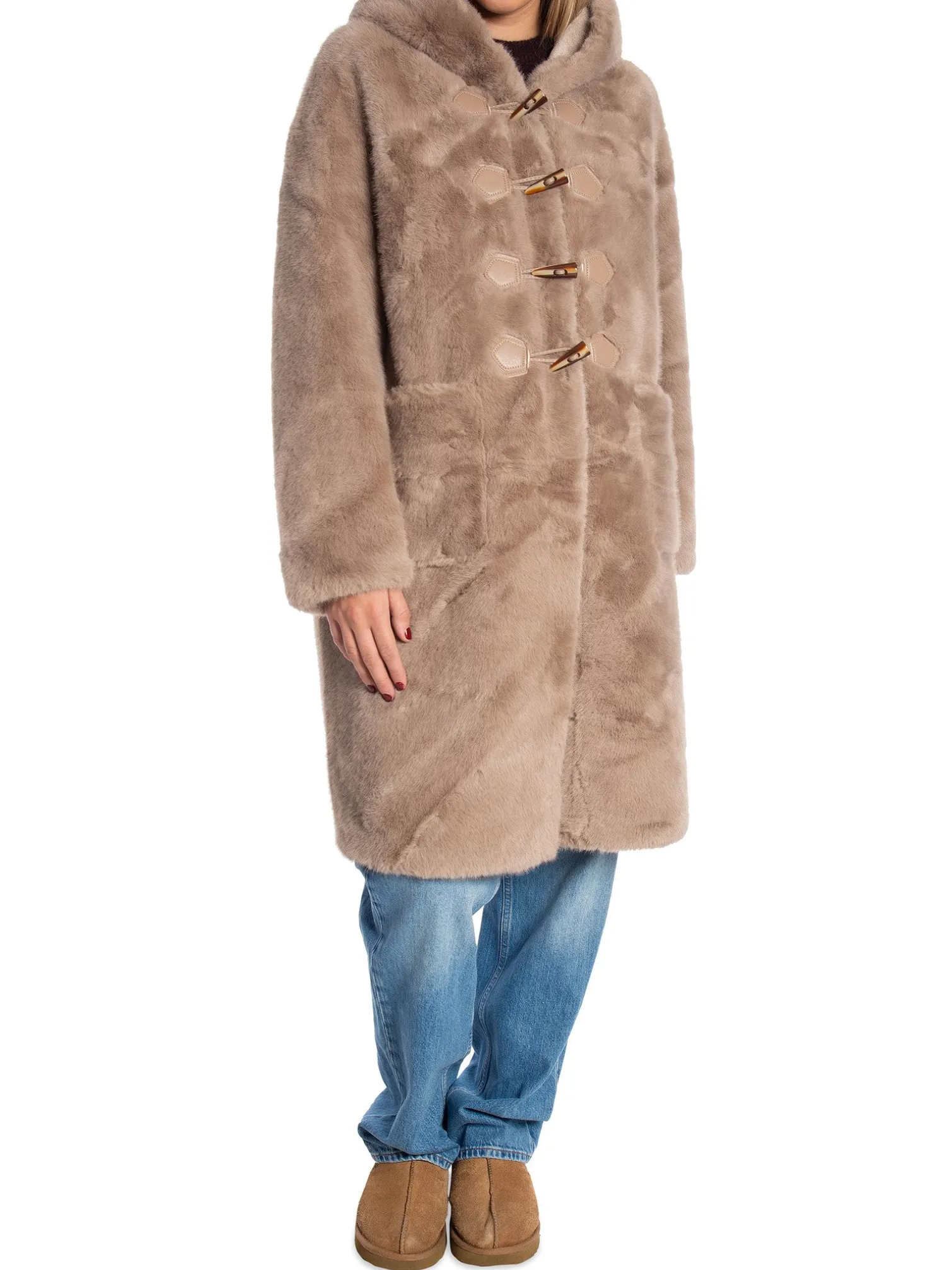 Coat Mid-length Faux Fur Hooded from Copperose. A stylish soft faux fur coat with a duffel fastening at the front and a stylish hood. The perfect coat to add to your wardrobe for chilly days!