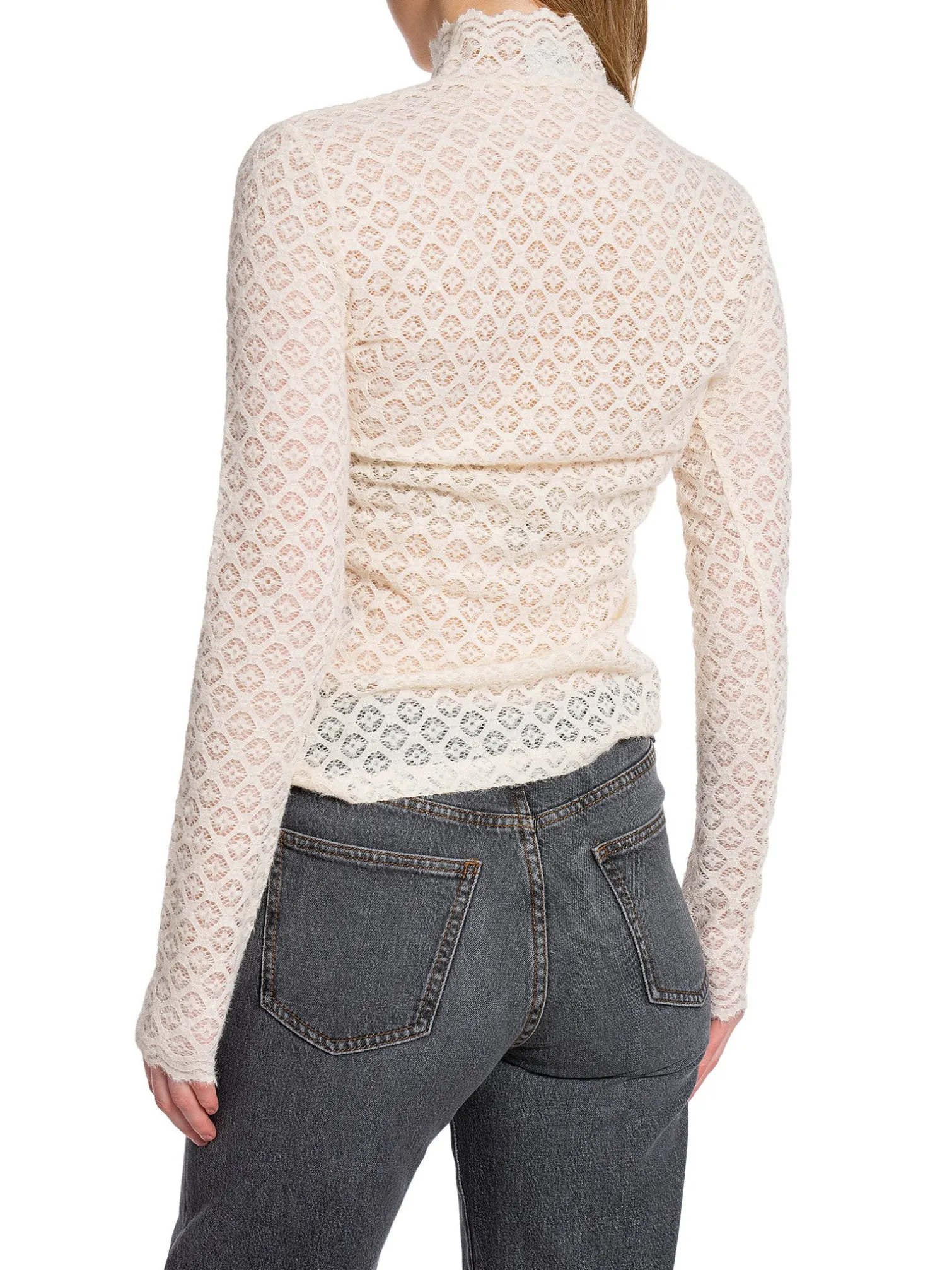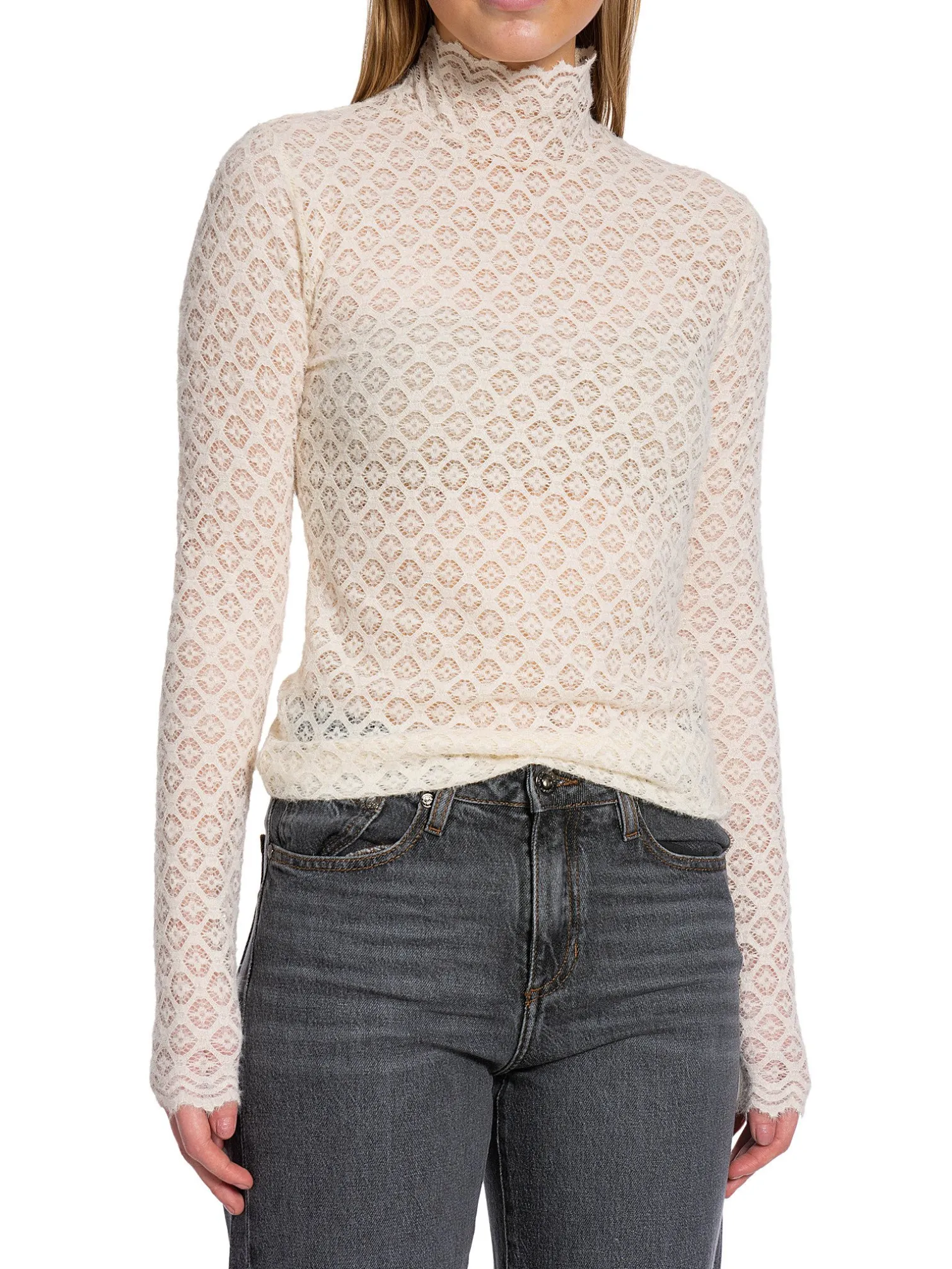 Top Como Fancy Turtle fromDante 6. A lovely jacquard knitted lace top in a soft and stretchy material. The top is designed with a high collar with a wavy edge on the collar and sleeve ends. Super nice to wear as a top with a pair of suit pants or wear under a jacket for an elegant look.