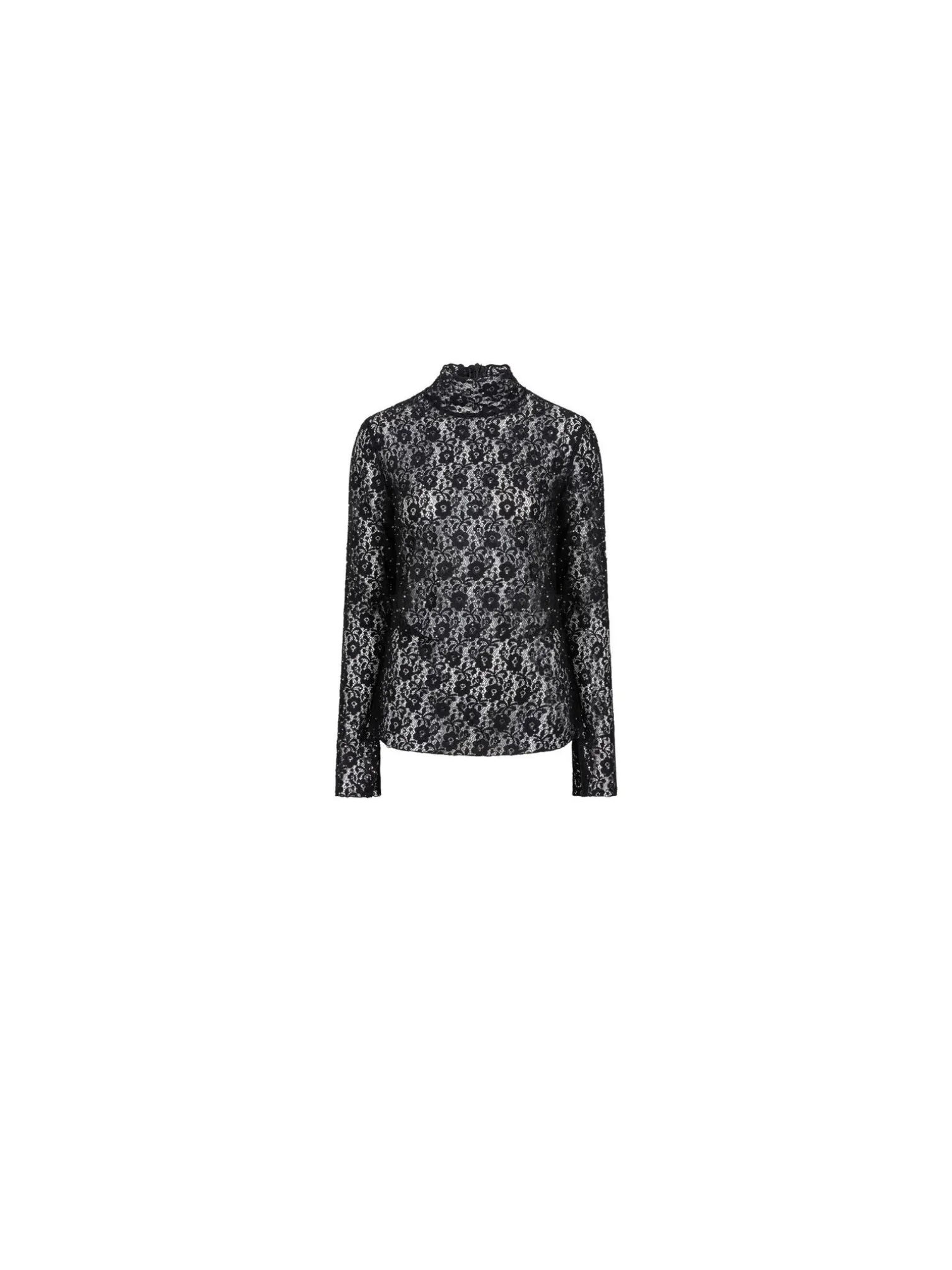 Top Prebble Lace by Dante6. A trendy straight fit lace top in a crepe fabric. Designed with a high collar, light trumpet sleeves with slits and decorative rhinestones, closes with zip at the neck. Wear with leather trousers for a stylish autumn look!