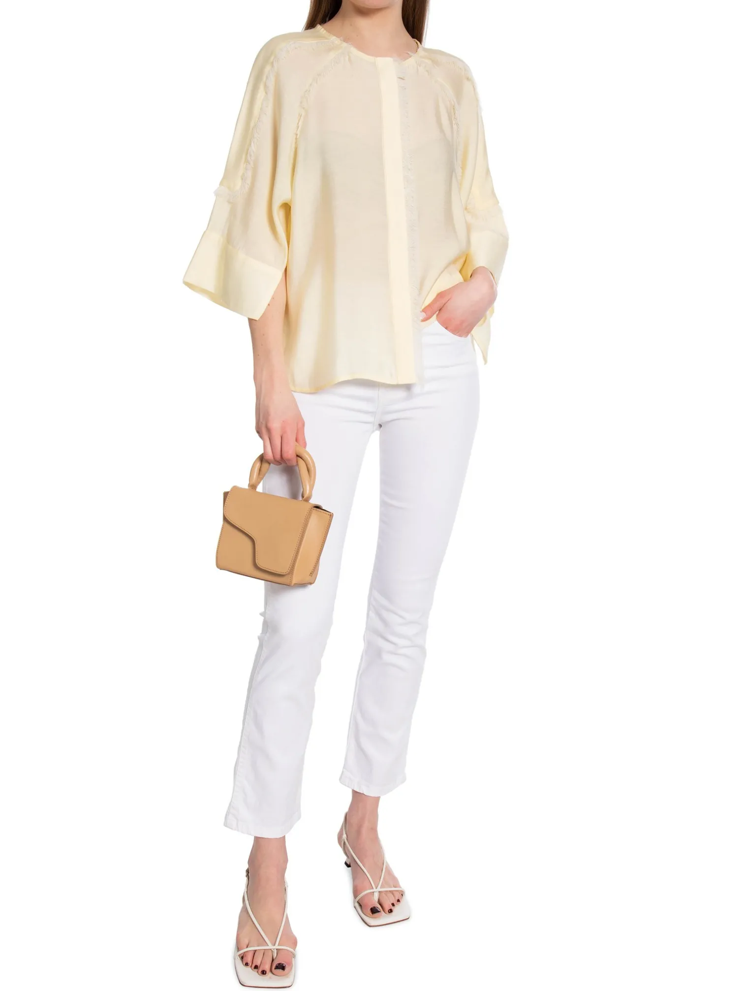 Bluse Kylie from Day. Gorgeous lemon yellow blouse with fringe details and buttoning at the front. Style with jeans for a spring look!