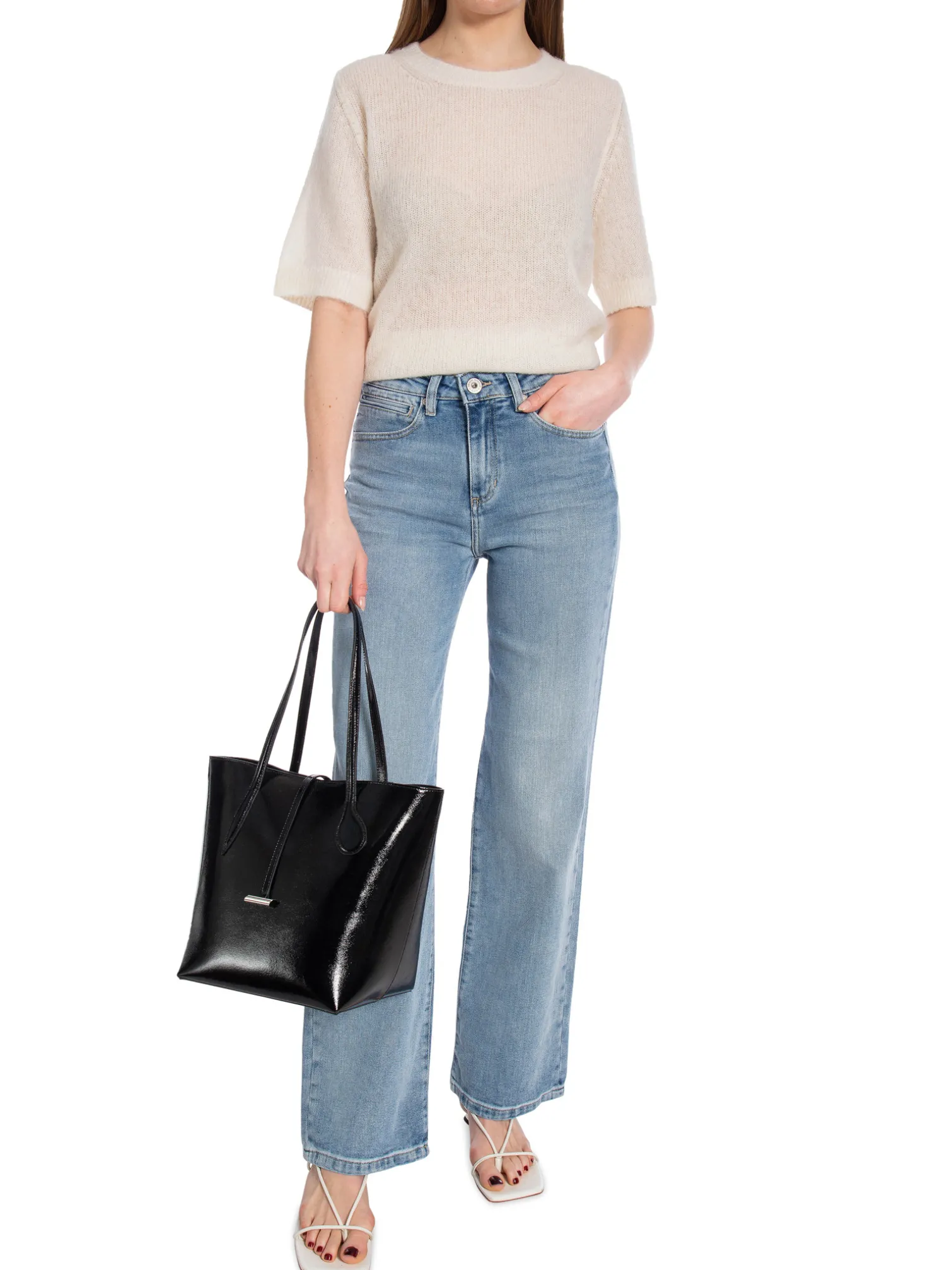 Jeans Gabin from Denim Studio Paris. A pair of stylish jeans in a straight model. The trousers have a high waist, two back and front pockets and silver buttons. Wear the jeans with a white shirt for a classic look!