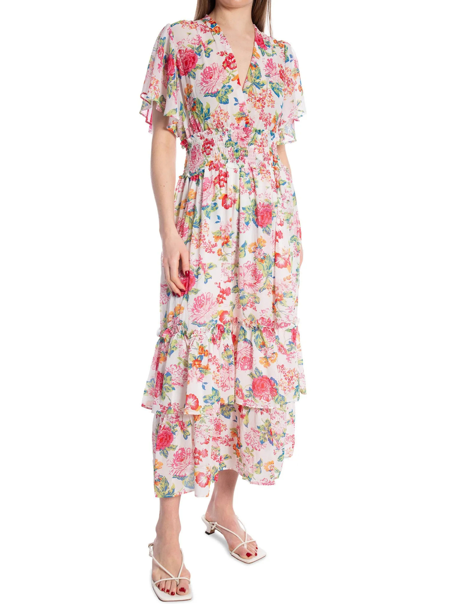 Dress Flower Printed Wrap from Luc-ce. The dress has beautiful ruffle details, a marked waist and a V-neck neckline at the front. Designed in a lovely summery pattern. Wear with a pair of sandals.