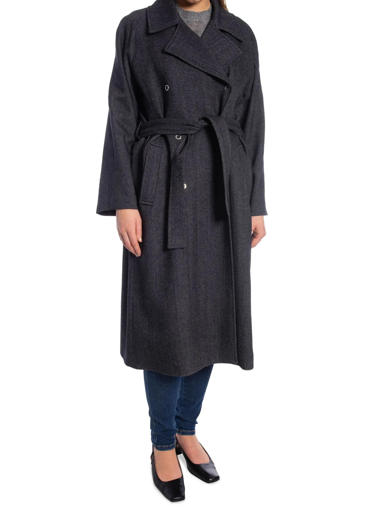 Siena coat from Filippa K. A straight, lovely coat with a slightly oversized fit. Silver details on the buttons, pockets and fastened with a belt at the waist. Style with a pair of black jeans and your favorite knitted sweater.