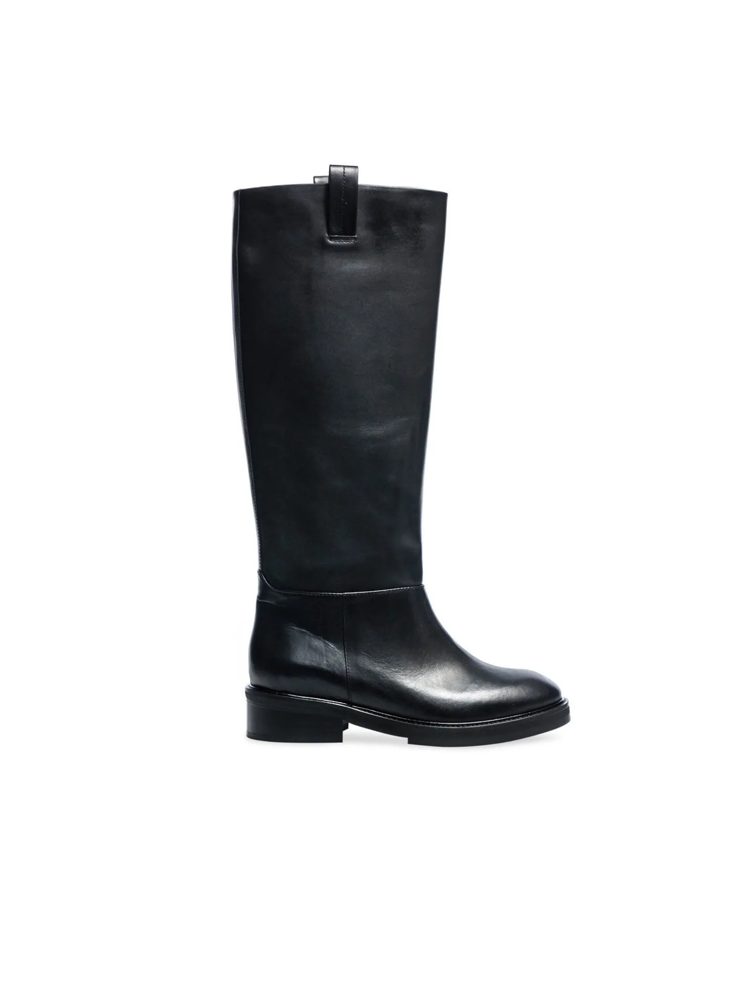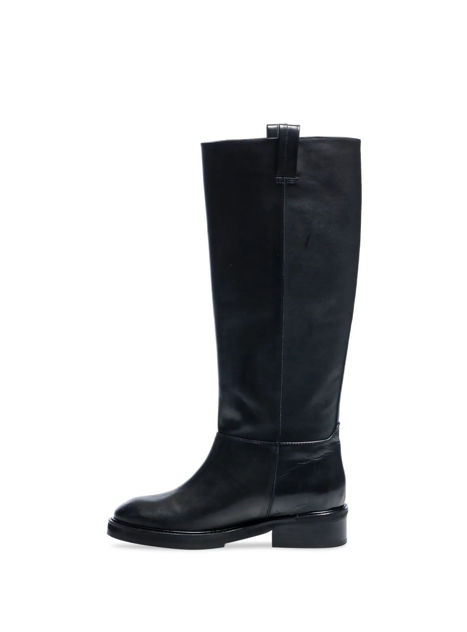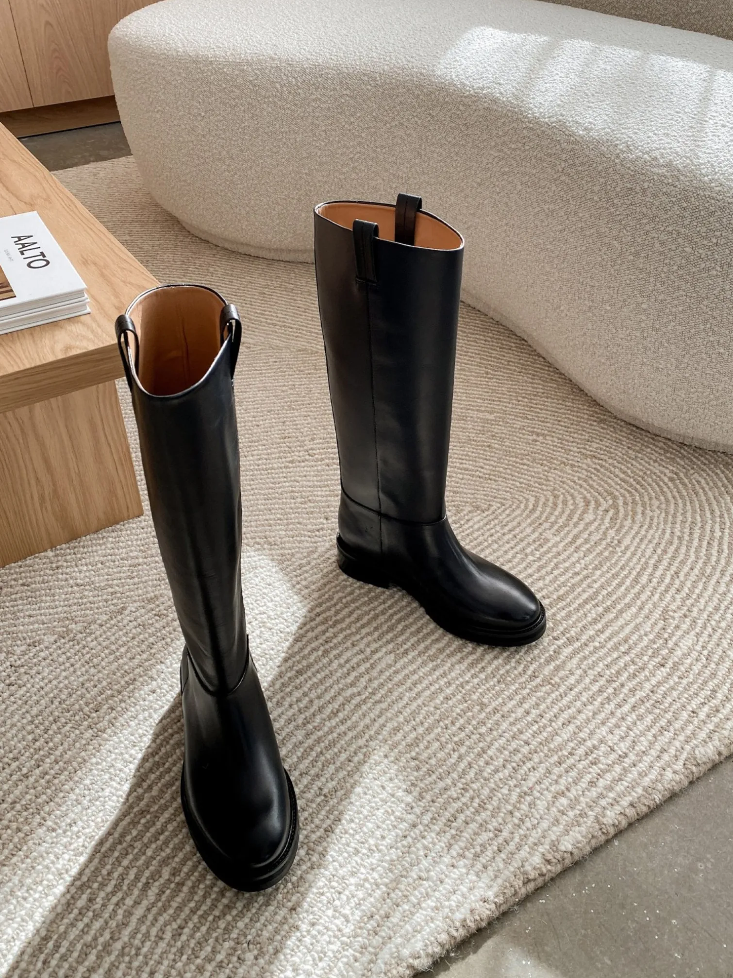 Frances boots from Flattered. A classic high leather boot that is handmade in Portugal. The boot has two flaps, a rounded toe and a low heel that is perfect for both everyday use and parties. Wear the boots with a patterned dress and a leather jacket!