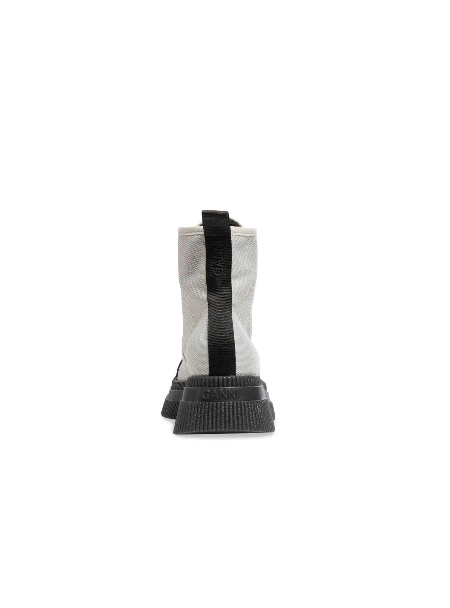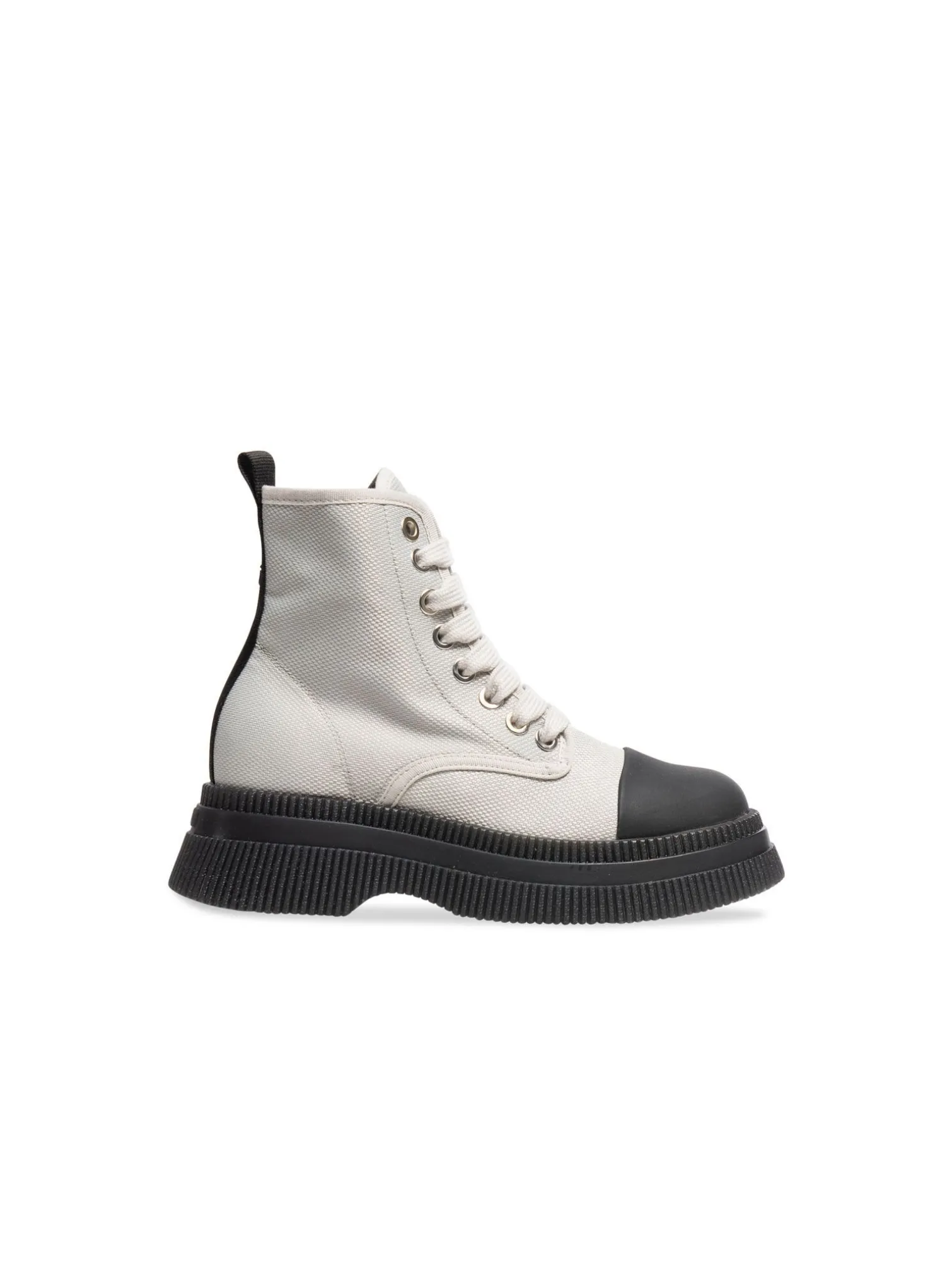 Boots Creepers from Ganni. They have lacing in canvas that has details in recycled rubber. They also have toe caps that are black and coarse creeper-inspired soles. There is also a black line at the back of the shoe that goes along all the way to the top along with a pull tab that makes it easy to get the foot into the shoe. Perfect to match with your favorite jeans.