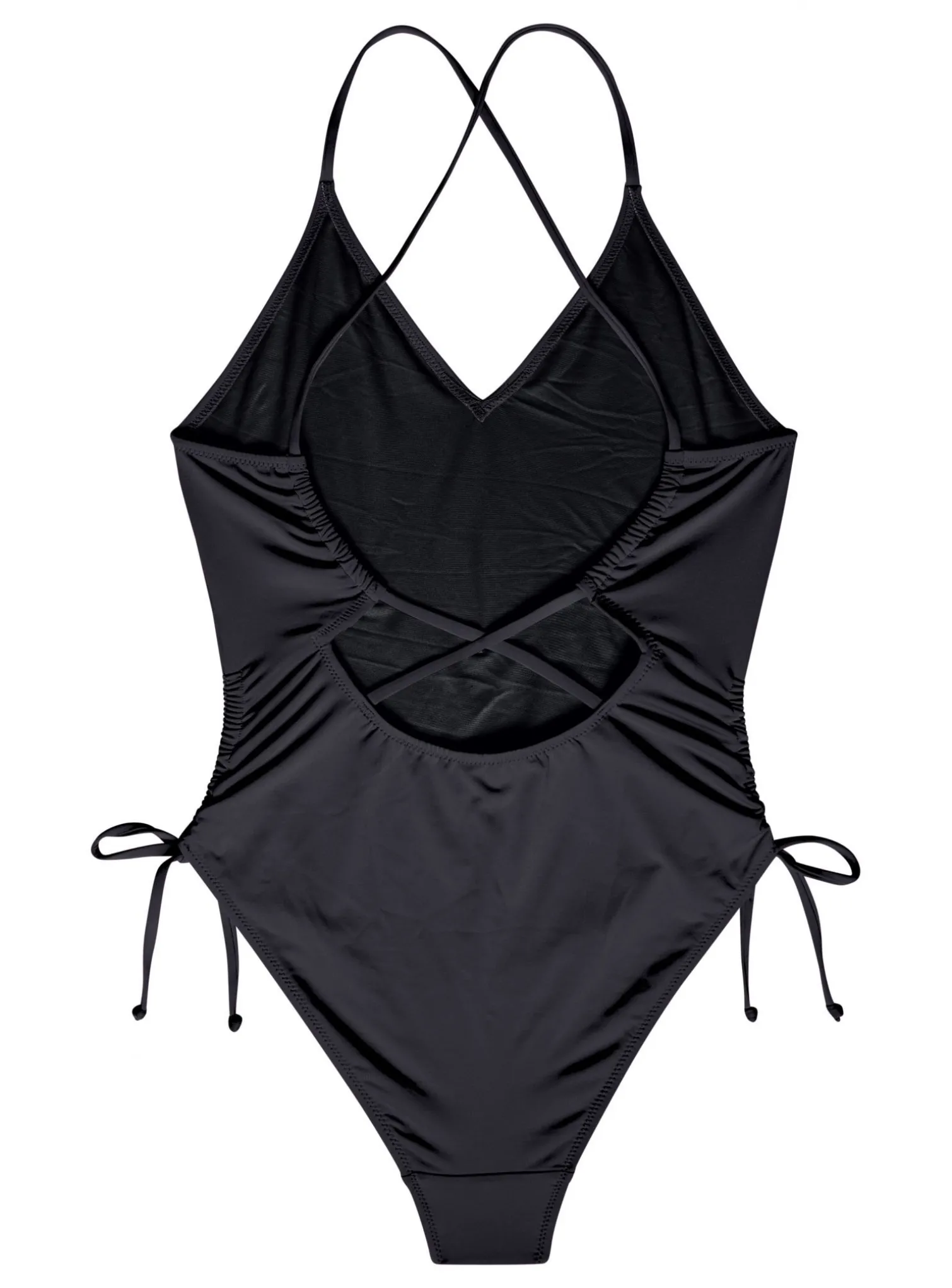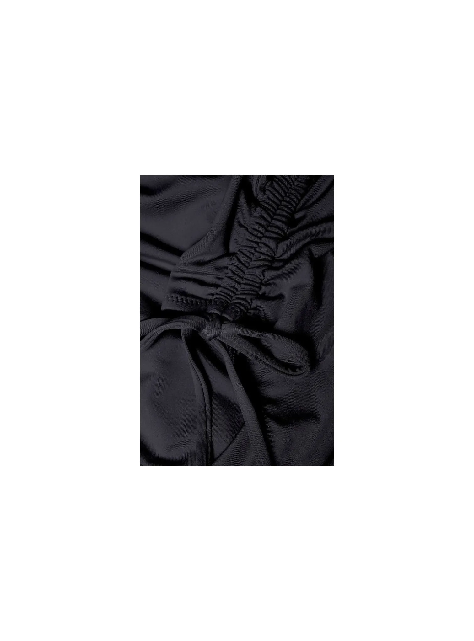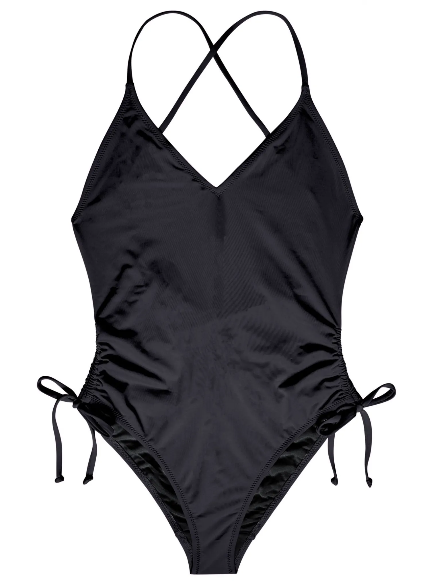 Swimsuit Yrsa from Gestuz in black. A stylish swimsuit with ribbons that cross each other in the back and lacing on the side. The swimsuit is made from recycled polyester, which reduces the use of oil used in the production of traditional polyester. Match with a pair of stylish sunglasses and a bucket hat for a trendy look!