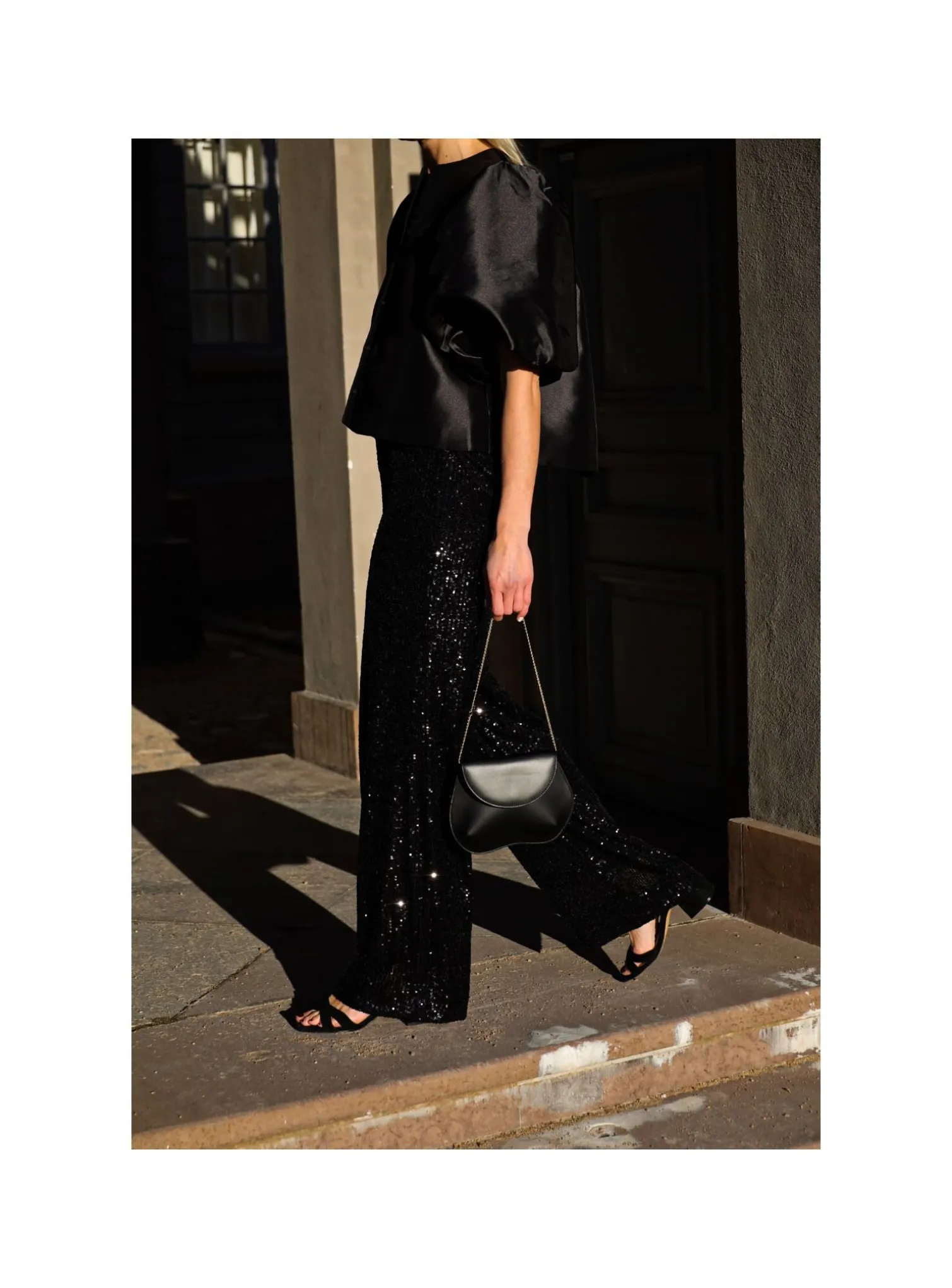 Pants Sittia from Gestuz. A pair of fantastic glitter pants in a wide model that gives a flattering silhouette. Elastic at the waist and a lining in viscose quality which makes them very comfortable. The perfect pants to wear to the party with a pair of heels!