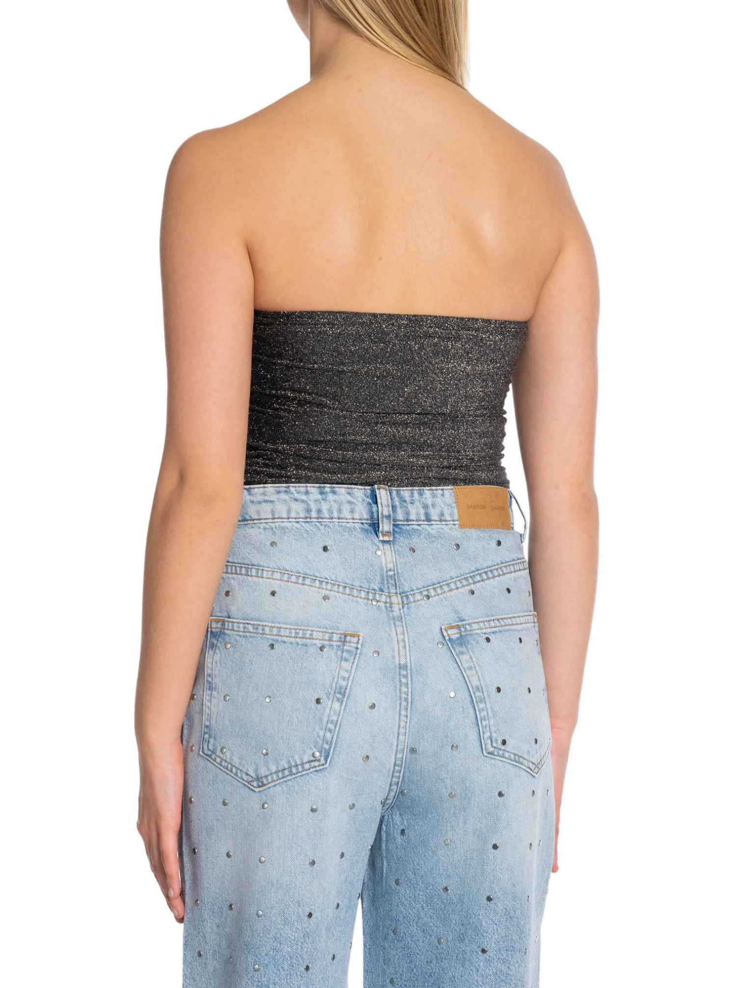 Top Alexia Tube from Gestuz. A little tube top in a silver glitter design. Optional shoulderstraps that ties in the neck. Wear to a partu and underneath your blazer!