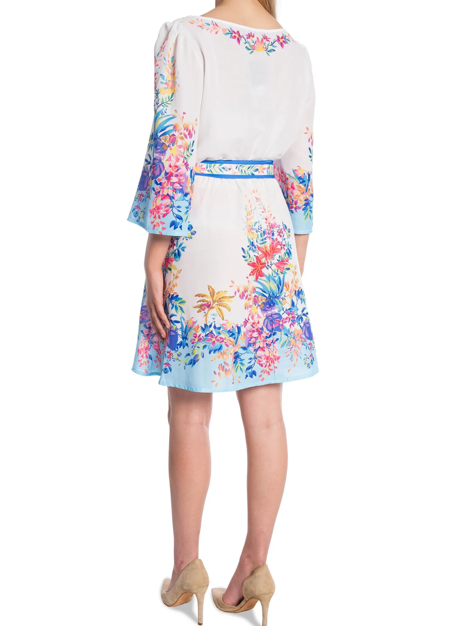 Dress from Jus De Pom. A short floral v-neck dress in a loose fit silhouette with a front slit. There are bands and elastic at the waist.