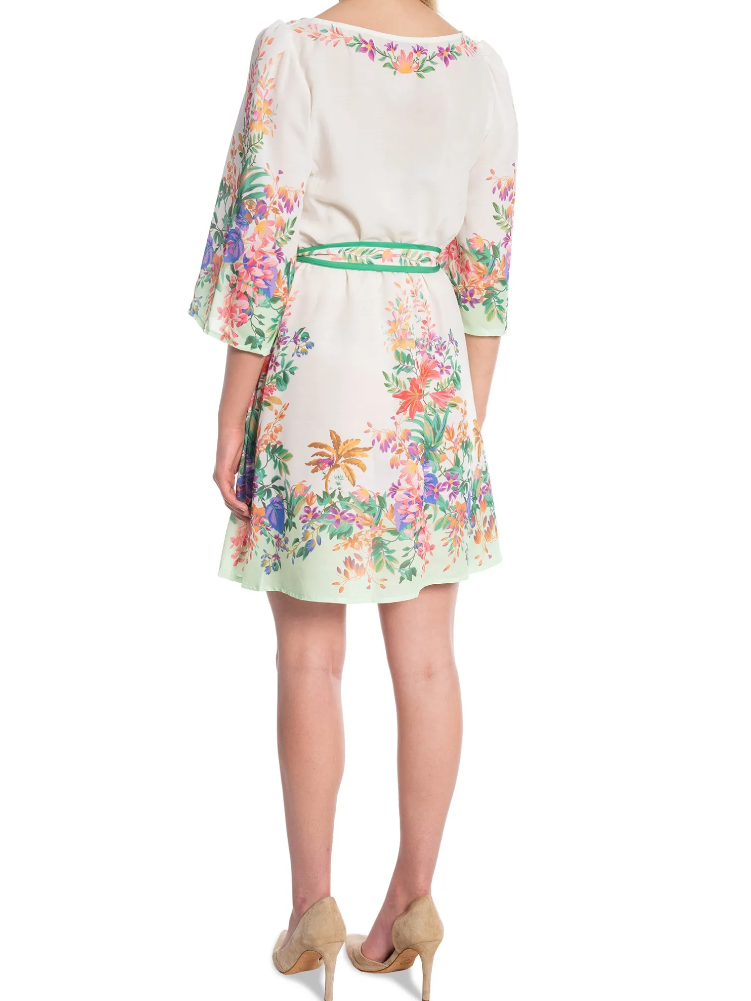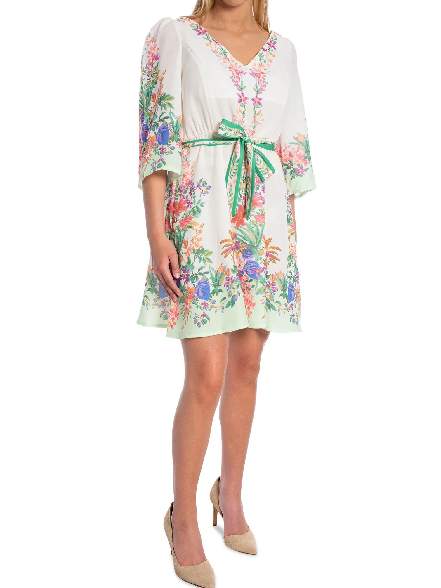 Dress from Jus De Pom. A short floral v-neck dress in a loose fit silhouette with a front slit. There are ties and elastic at the waist.