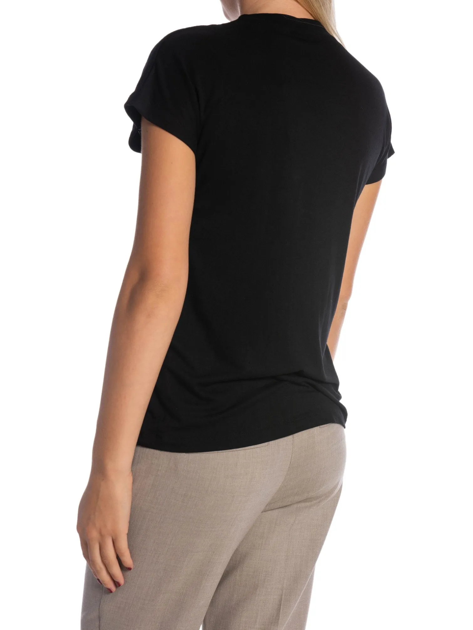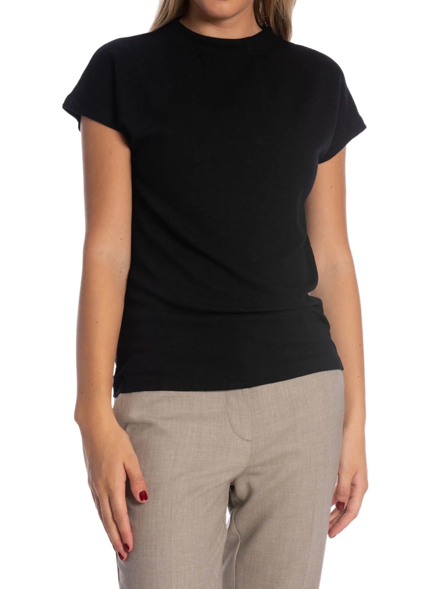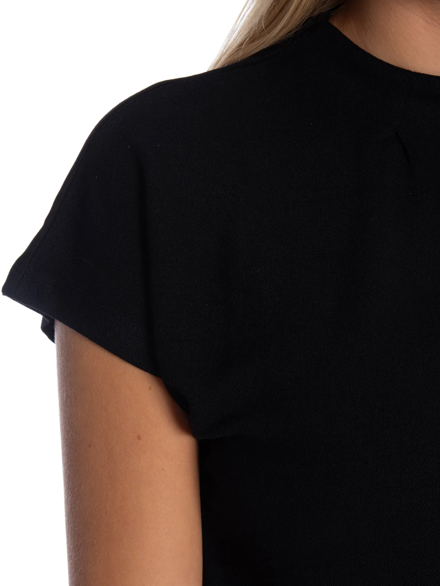 Topp Dandy from Karen by Simonsen. A trendy top with a slightly higher collar and short sleeves. Designed with ruching details at the neck. Wear under a blazer with a pair of denim!