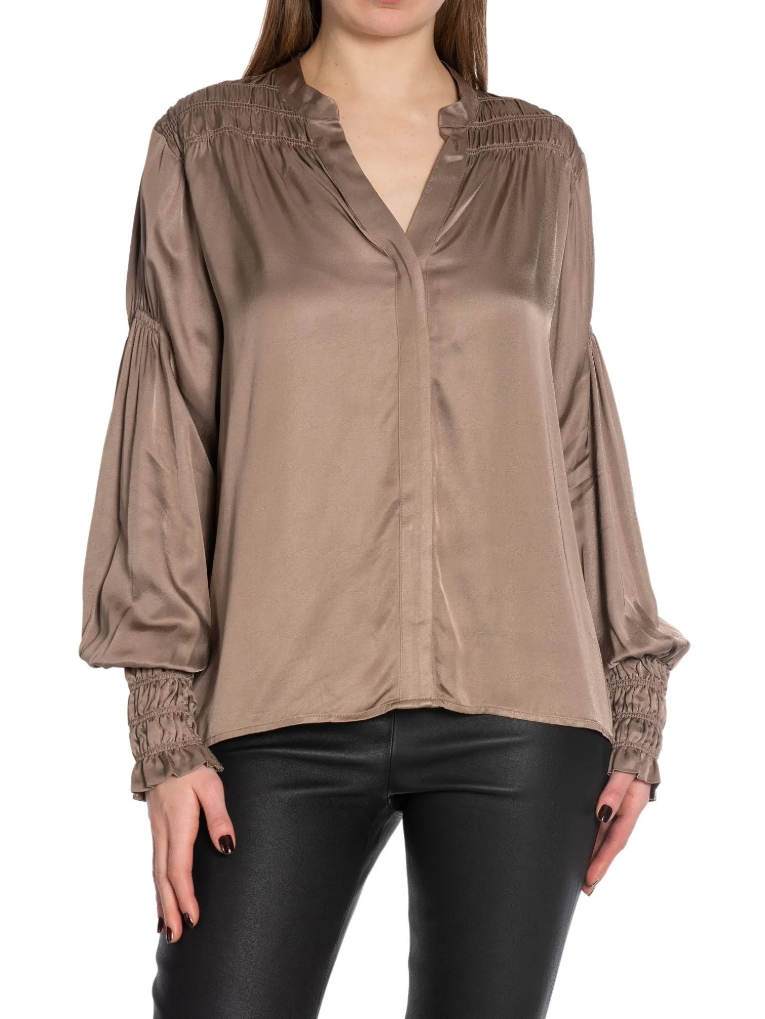 Blouse Estel from Levete Room. A silky blouse in a lovely walnut-color designed with smocked details at front and v-neckline. Closures with hidden buttons at front.