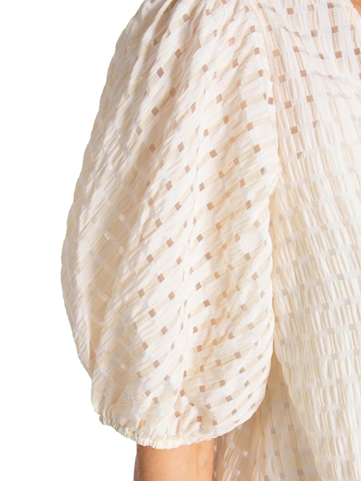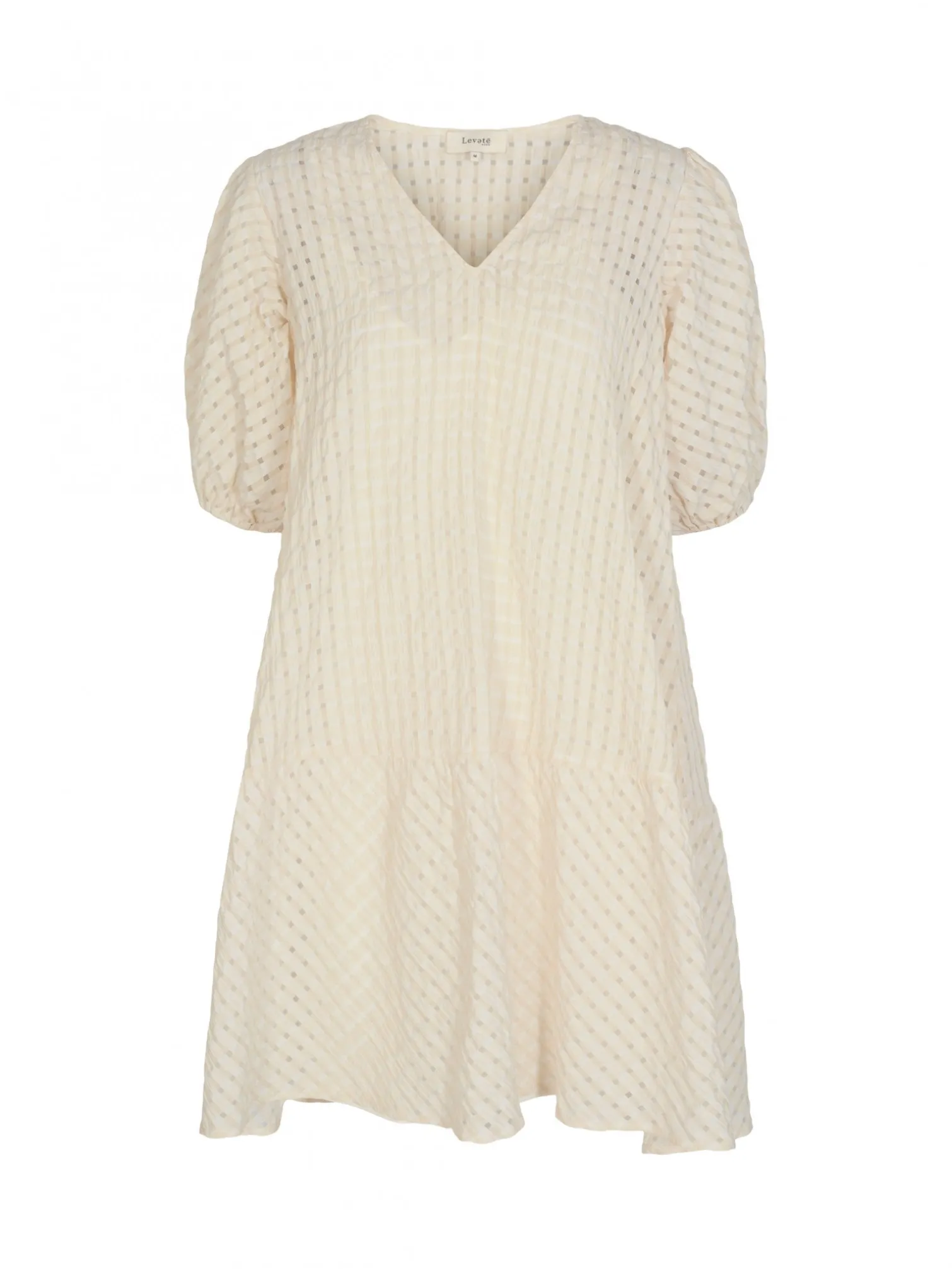 Dress Serina from Levete Room. The dress is designed in a beautiful A-line shape and comes with a petticoat. The feminine garment has a v-shaped neckline, short puff sleeves and a ruffle hem. Dress up with strap heels and accessories for a charming party look, or for daytime, choose sneakers and put on a sleeveless knit!