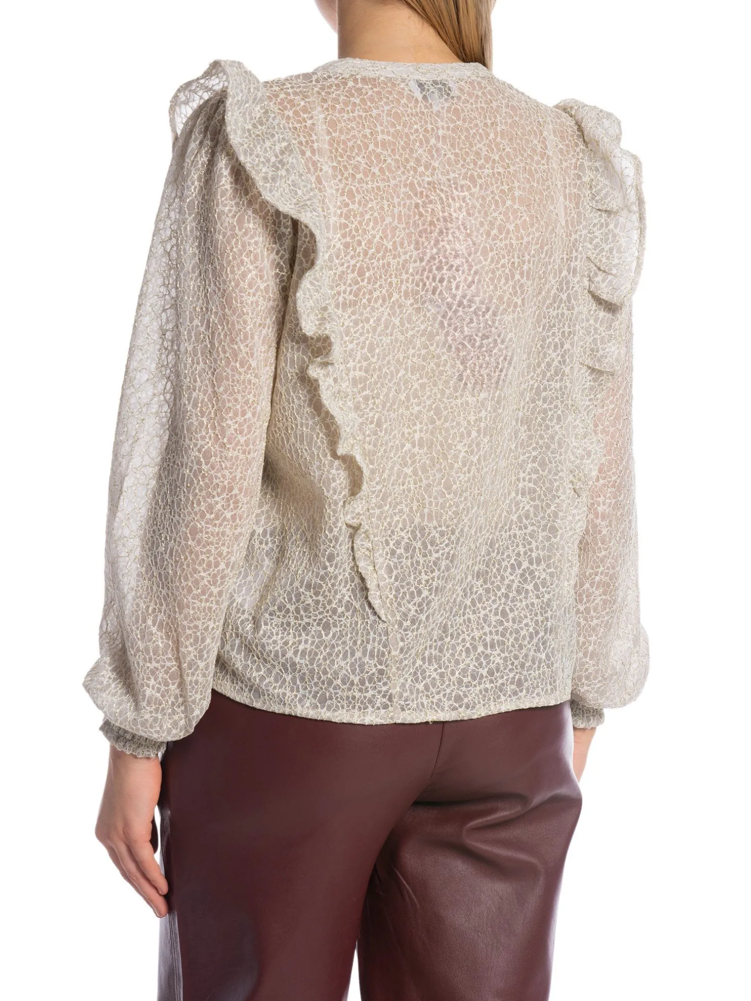Blouse Jerrie 2 from Levete Room. A flattering blouse with frill details and gold thread on both the front and back. It has a v-neckline, a concealed placket and balloon sleeves. Perfect to style with a pair of jeans or suit trousers!