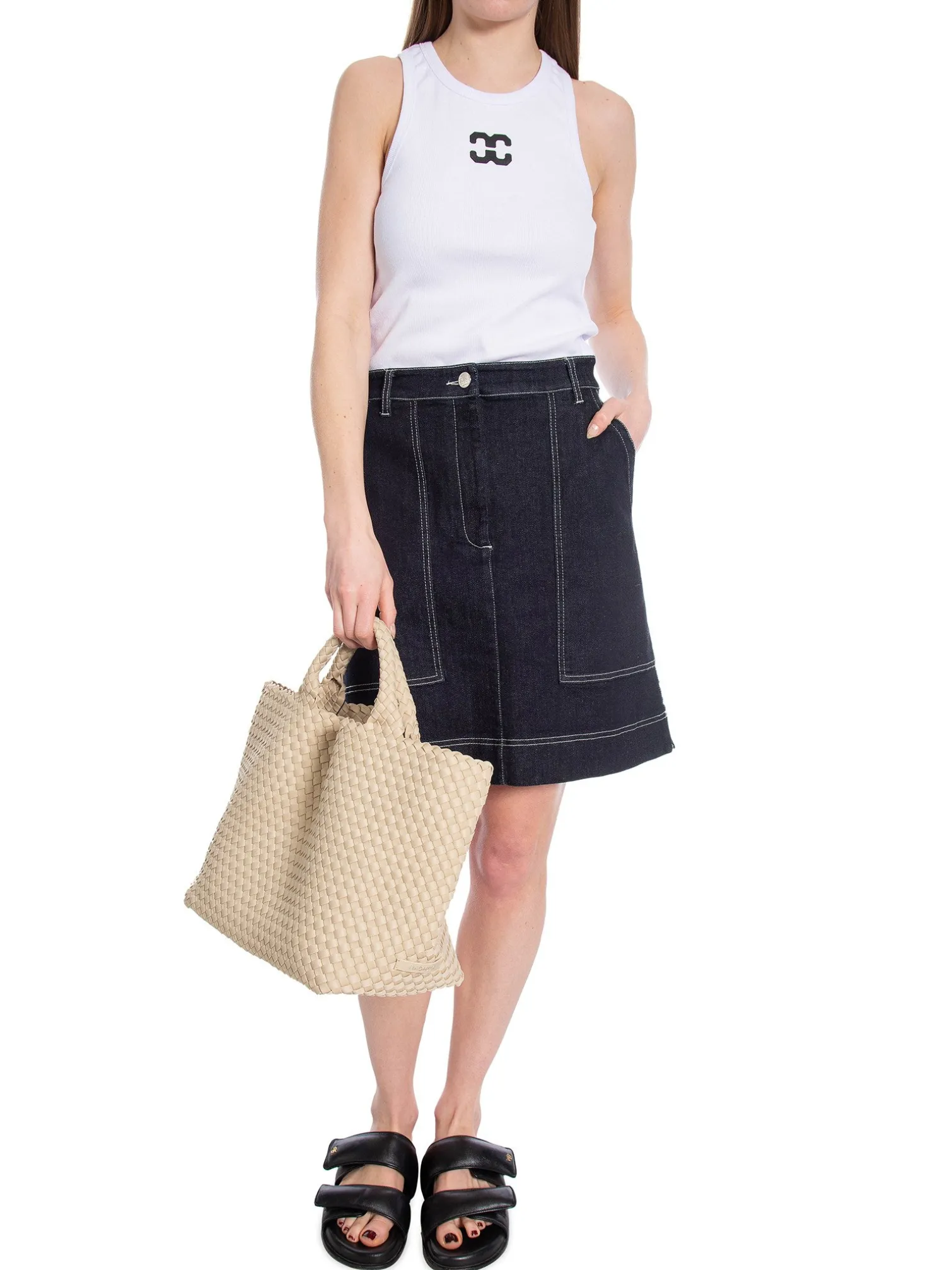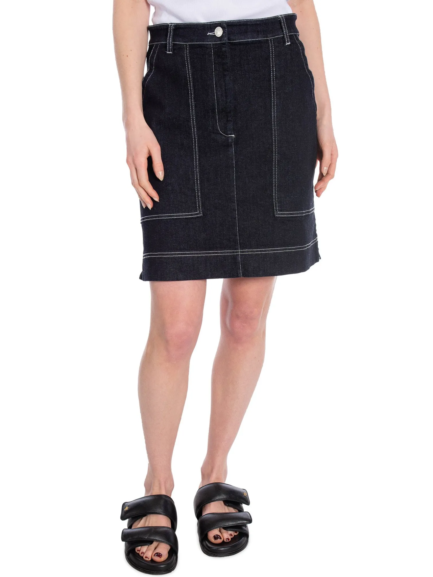 Skirt Freja from Levete Room. A cool shorter skirt that is tight in denim. The skirt has nice details, such as contrasting seams. Style it with a knitted sweater, oversized blazer and a pair of knee-high boots and you have a perfect look this spring!