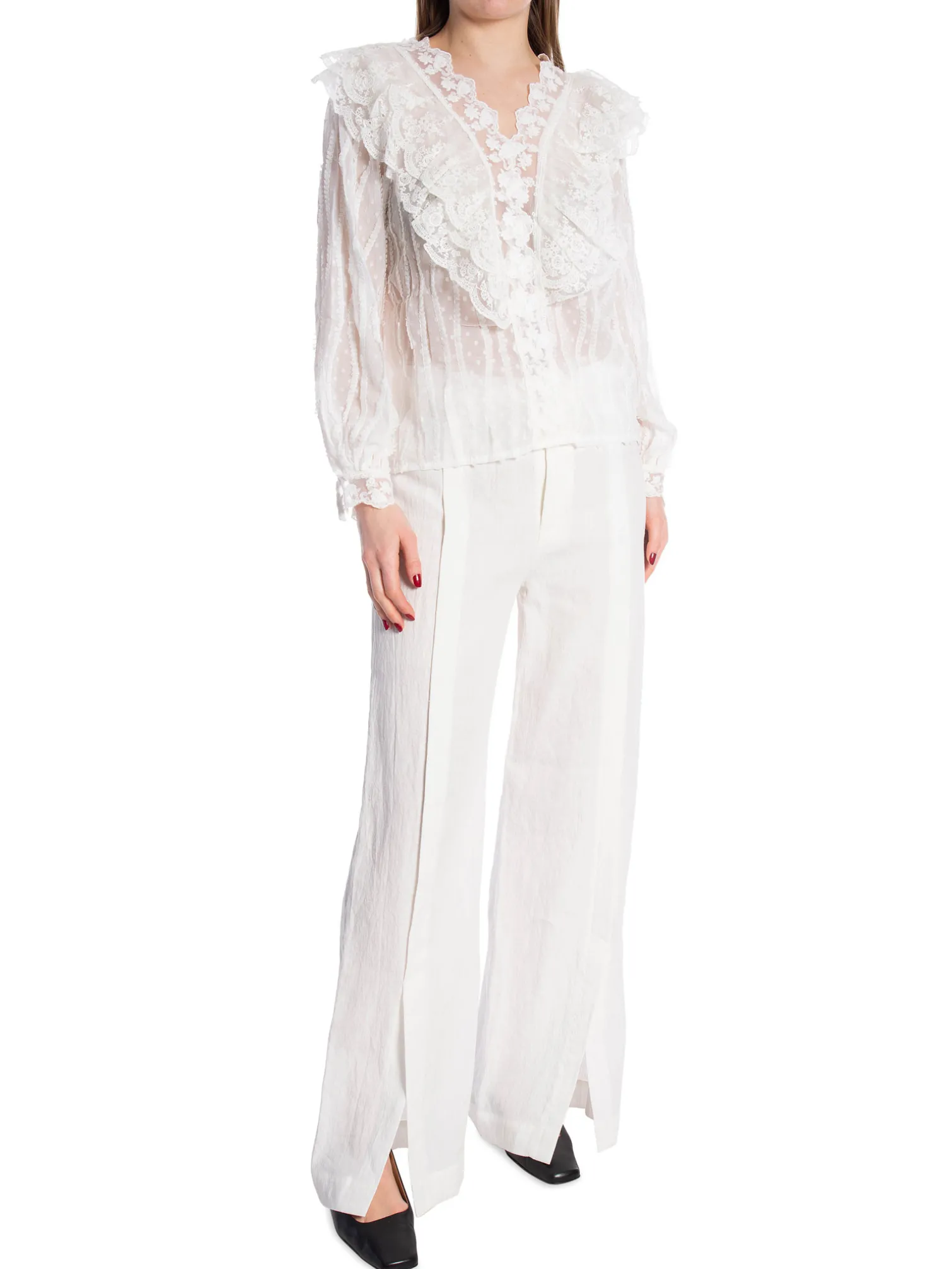 Blouse Lace from Lily Mcbee. Super cute long-sleeved blouse designed with ruffle and crochet details, elastic band at the cuffs and a V-neck look. Style together with a pair of denim or a nice skirt.