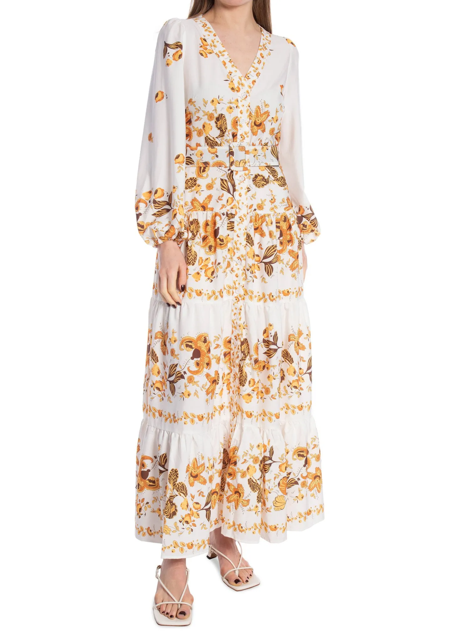 Dress from Lily Mcbee. A lovley longdress with a decorative pattern and a belt to fasten in the waist. V-neck and buttons in the front.