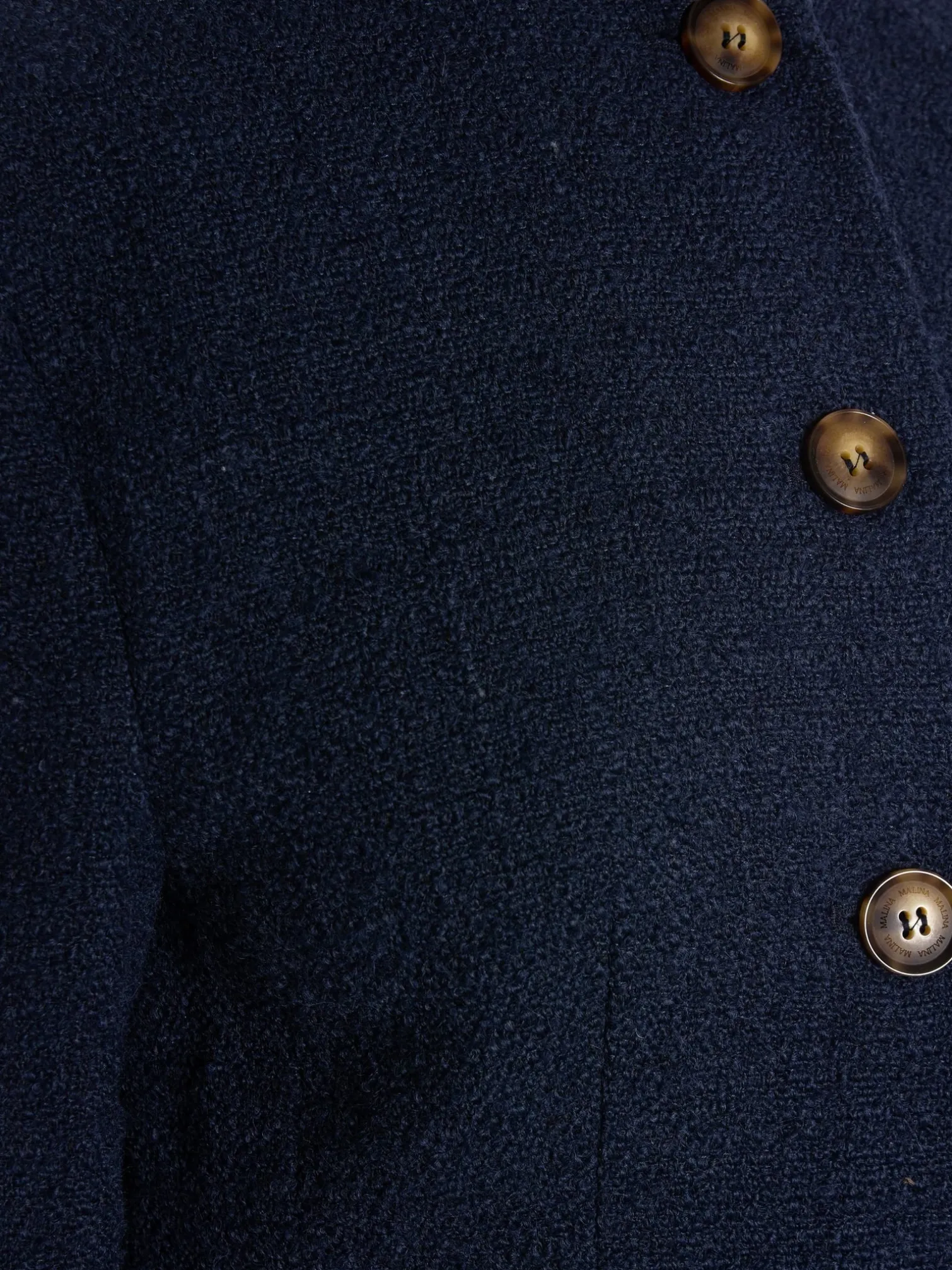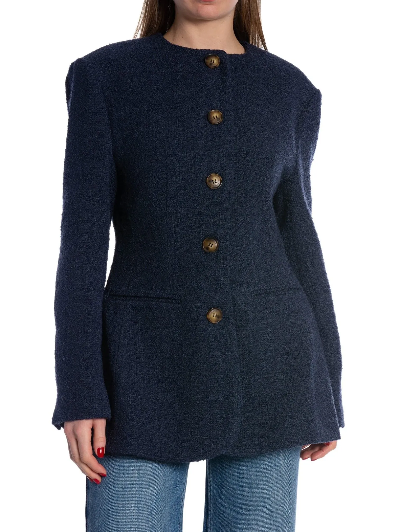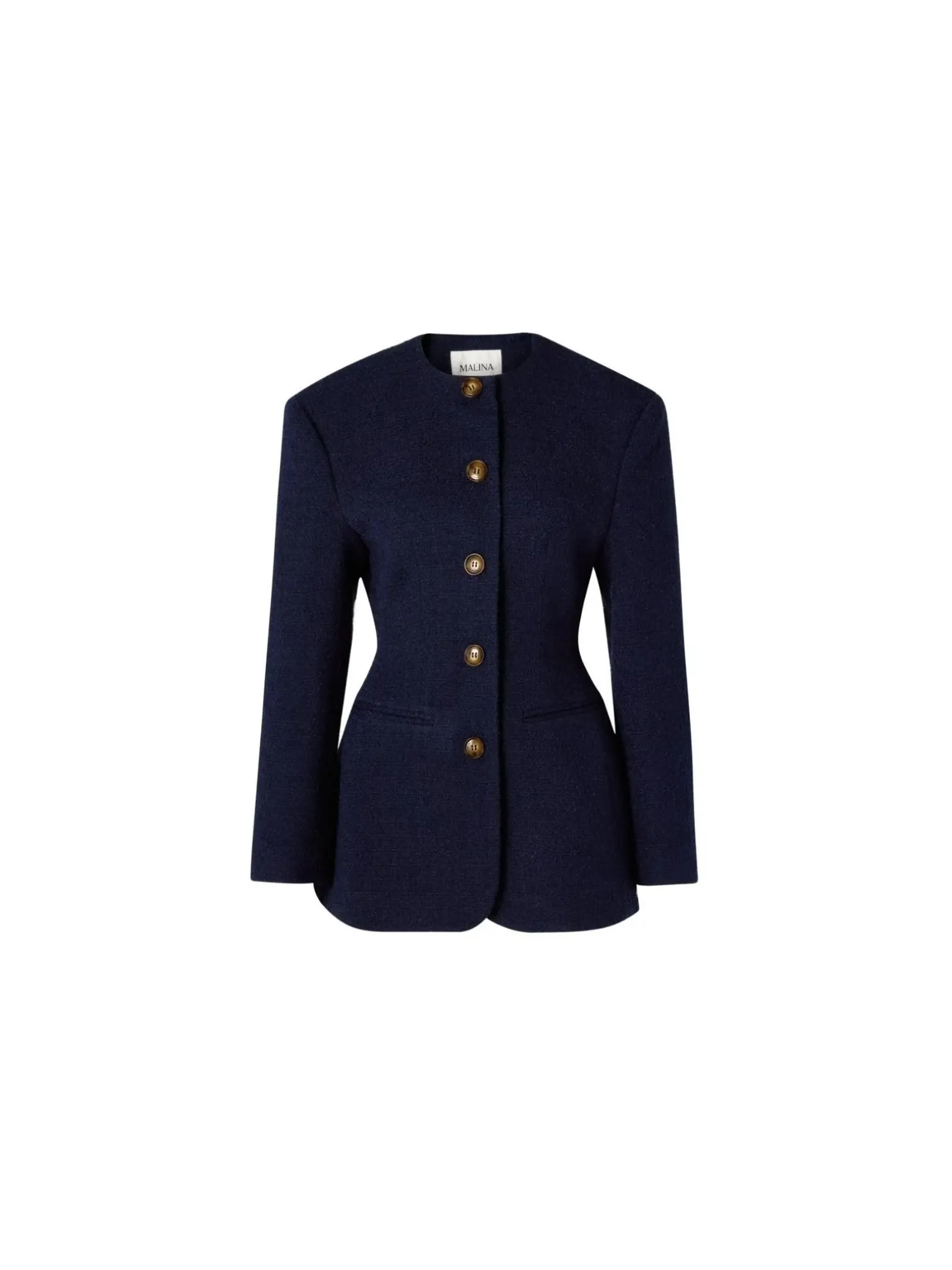 Blazer Carol from Malina. A stylish blazer in a fitted fit. The tapered waist gives a feminine elegant silhouette. The textured material creates a lovely contrast to the brown melange buttons. Style nicely with a skirt or a pair of blue jeans!