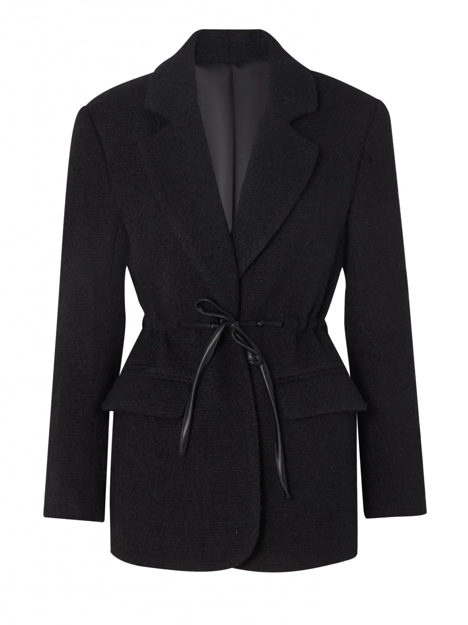 Blazer Elodie from Malina. Luxurious boucle knit long blazer in loose fit with shoulder pad. Designed with wide lapels, faux pockets on the front, drawstring waist with decorative leather bows.Style with tight trousers and a straight shirt for a trendy autumn look!