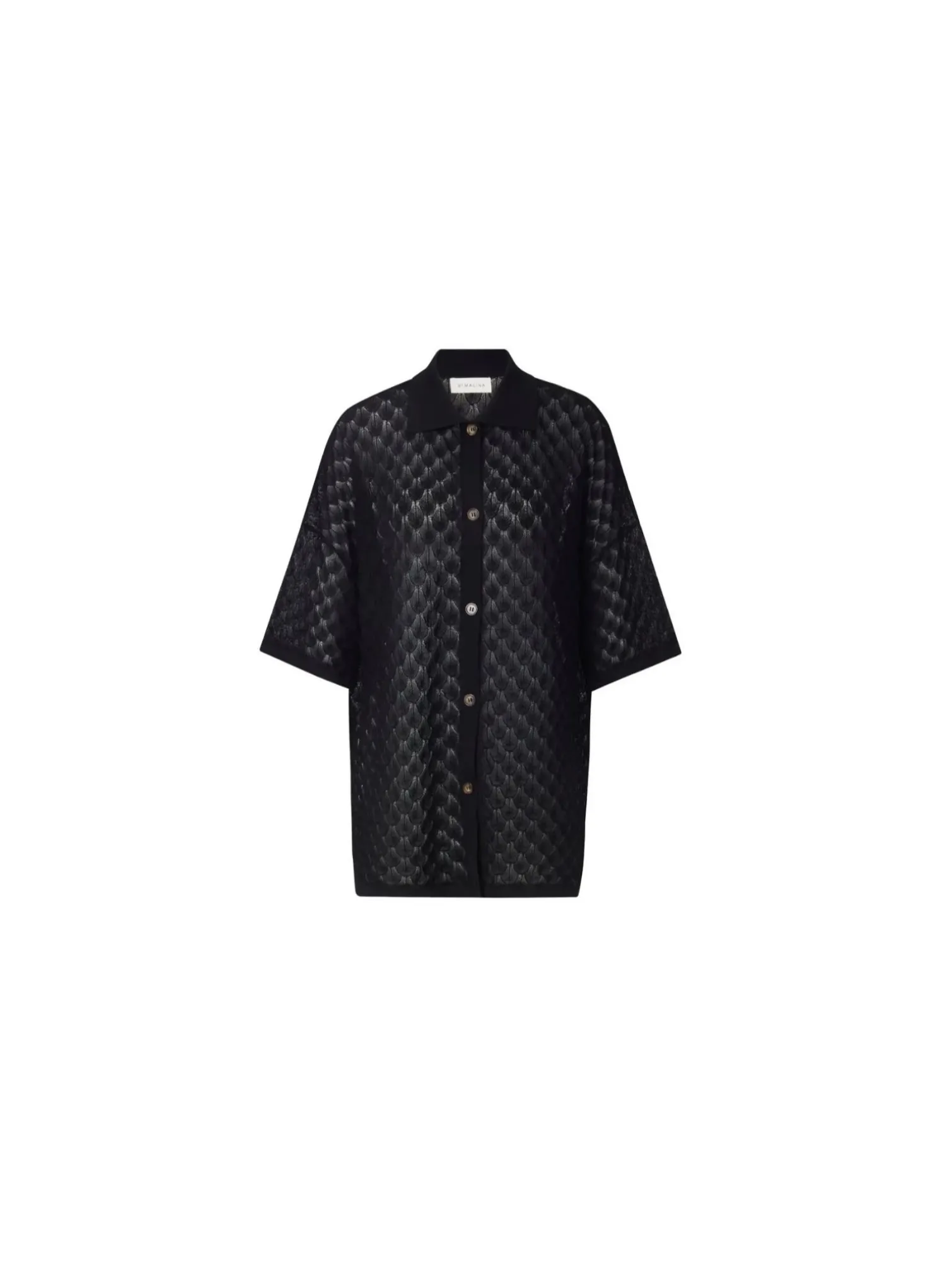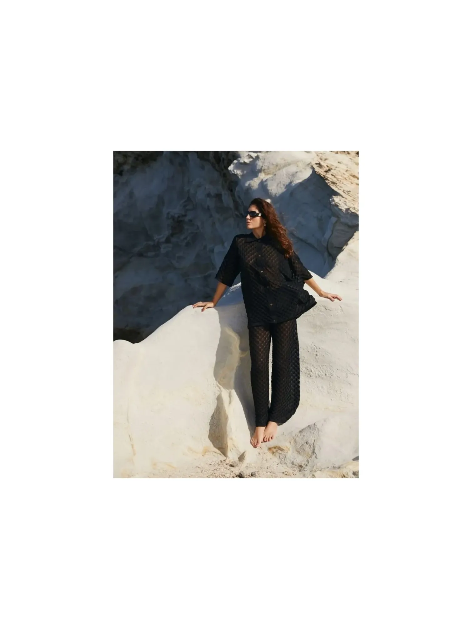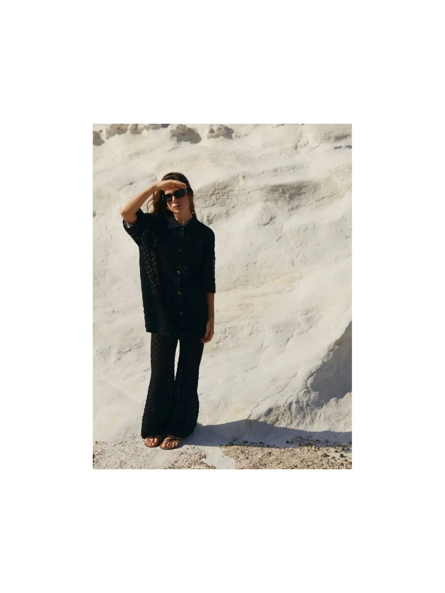 Top Moa from Malina. A beautiful knitted slightly transparent shirt top with buttons at the front. Designed in an oversized fit with a little extra length and dropped shoulders. Style together with the Alissa trousers from Malina for a complete set!