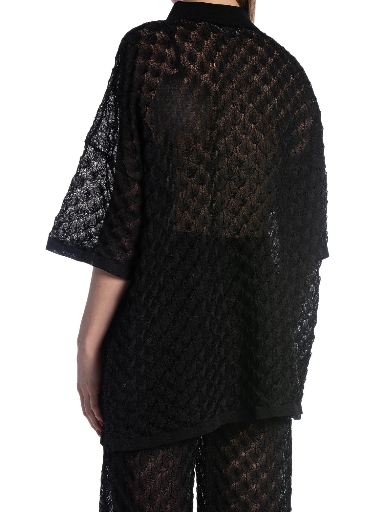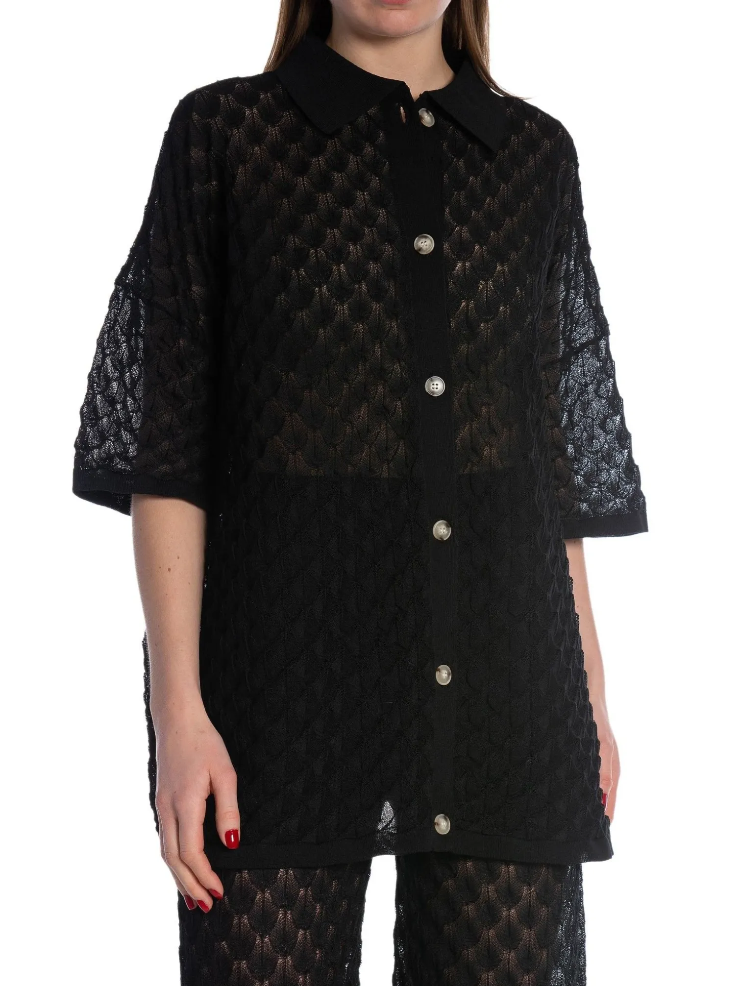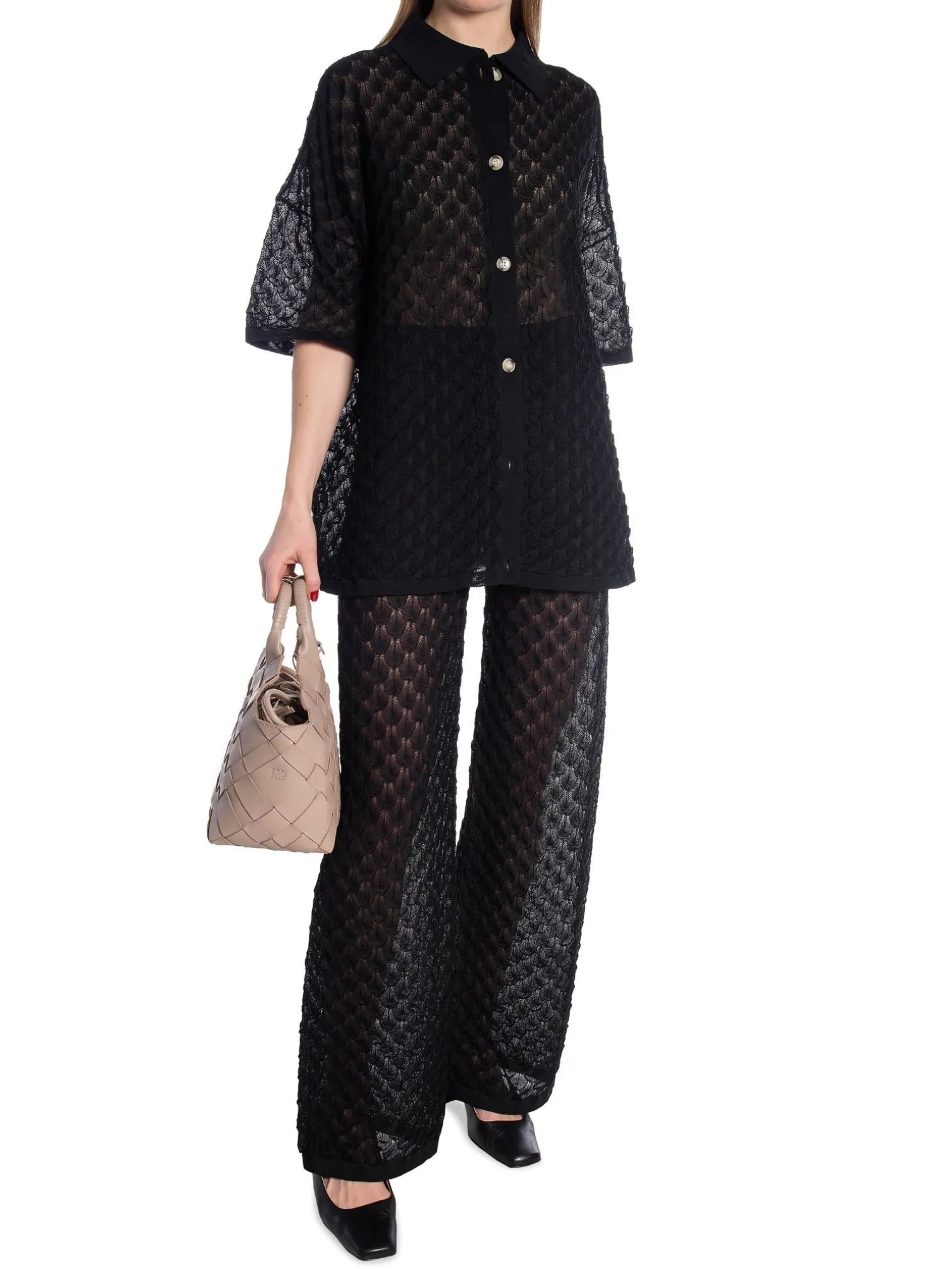Top Moa from Malina. A beautiful knitted slightly transparent shirt top with buttons at the front. Designed in an oversized fit with a little extra length and dropped shoulders. Style together with the Alissa trousers from Malina for a complete set!