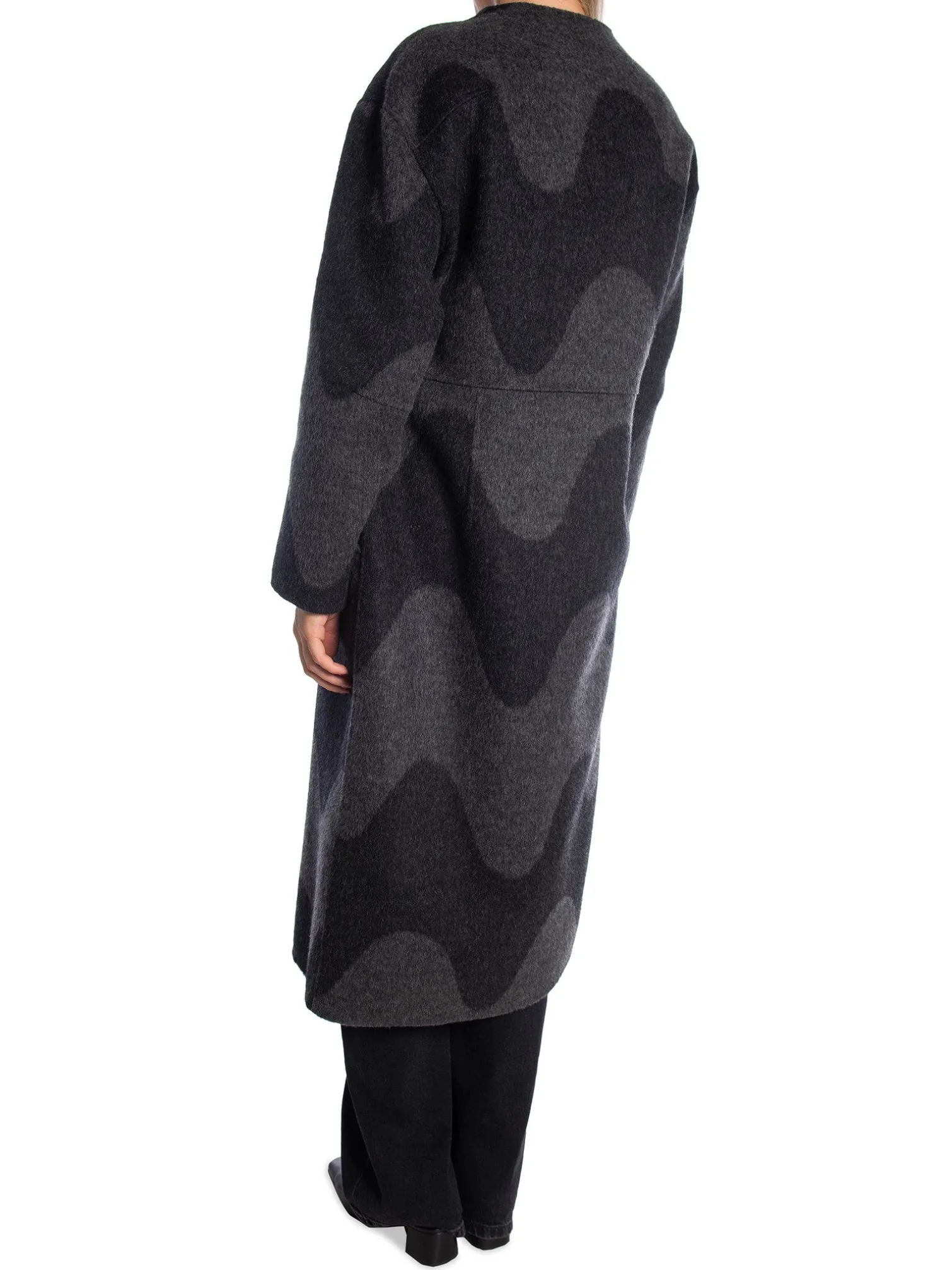 Coat Elfa Lokki from Marimekko.A beautiful wool blend coat in Marimekko’s classic pattern. Closes with both a button and a belt that goes inside the coat.The coat also has spacious side pockets. Wear with a pair of jeans and loafers for a stylish fall look!