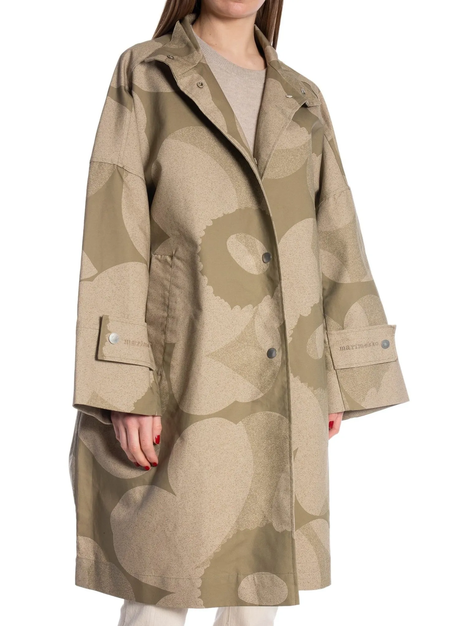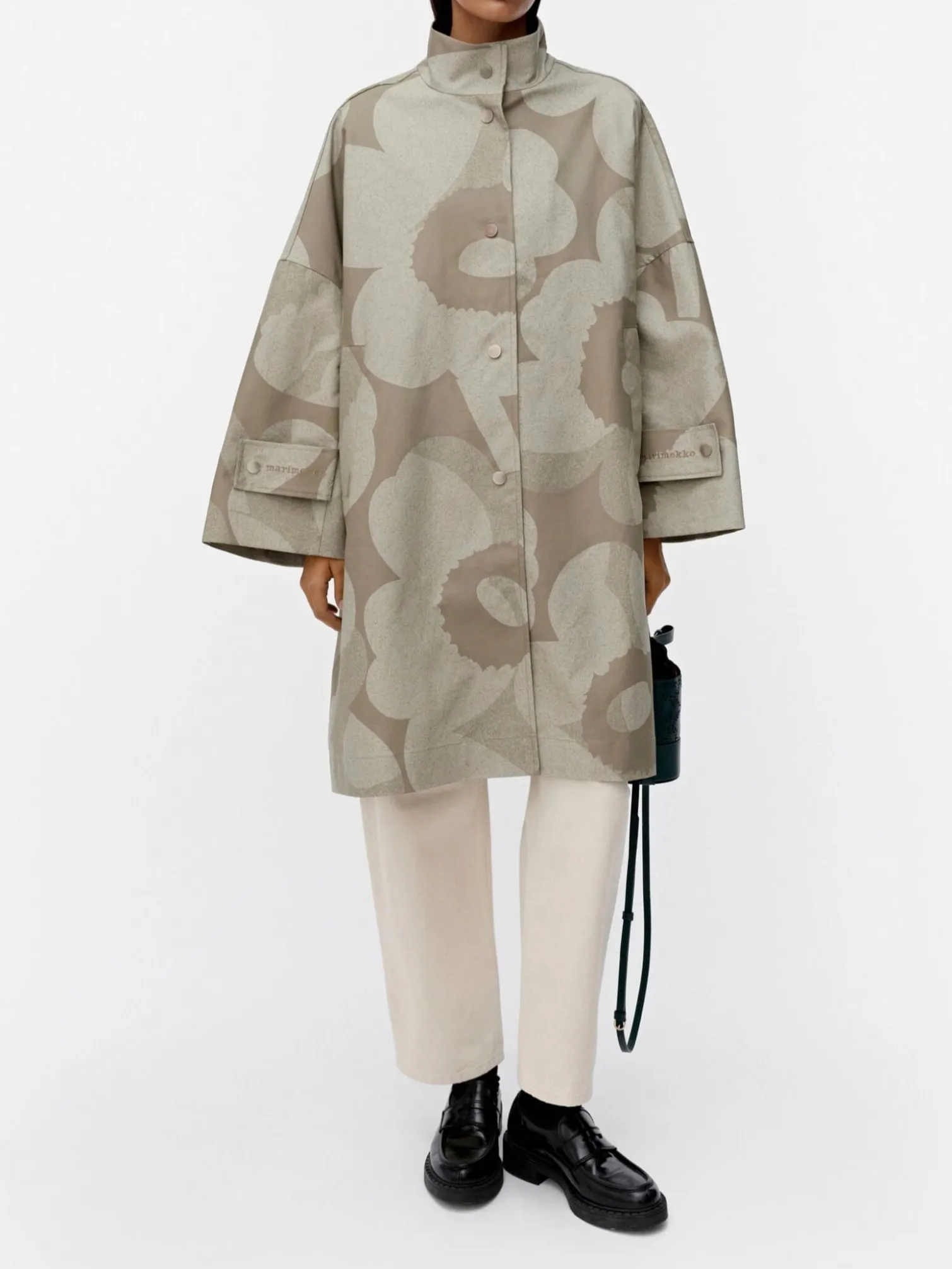 Jacket Anteesi from Marimekko. The Anteesi coat is made of firm organic cotton and it has an oversized, A-line fit. The coat features the Unikko pattern, and a high stand-up collar, snap button closure and wide front pockets. The cape-like coat has wide sleeves that are lowered from the shoulders, and the cuffs have wide flaps with snaps that have embroidered Marimekko logos. There is a central seam and a long hem slit in the back.