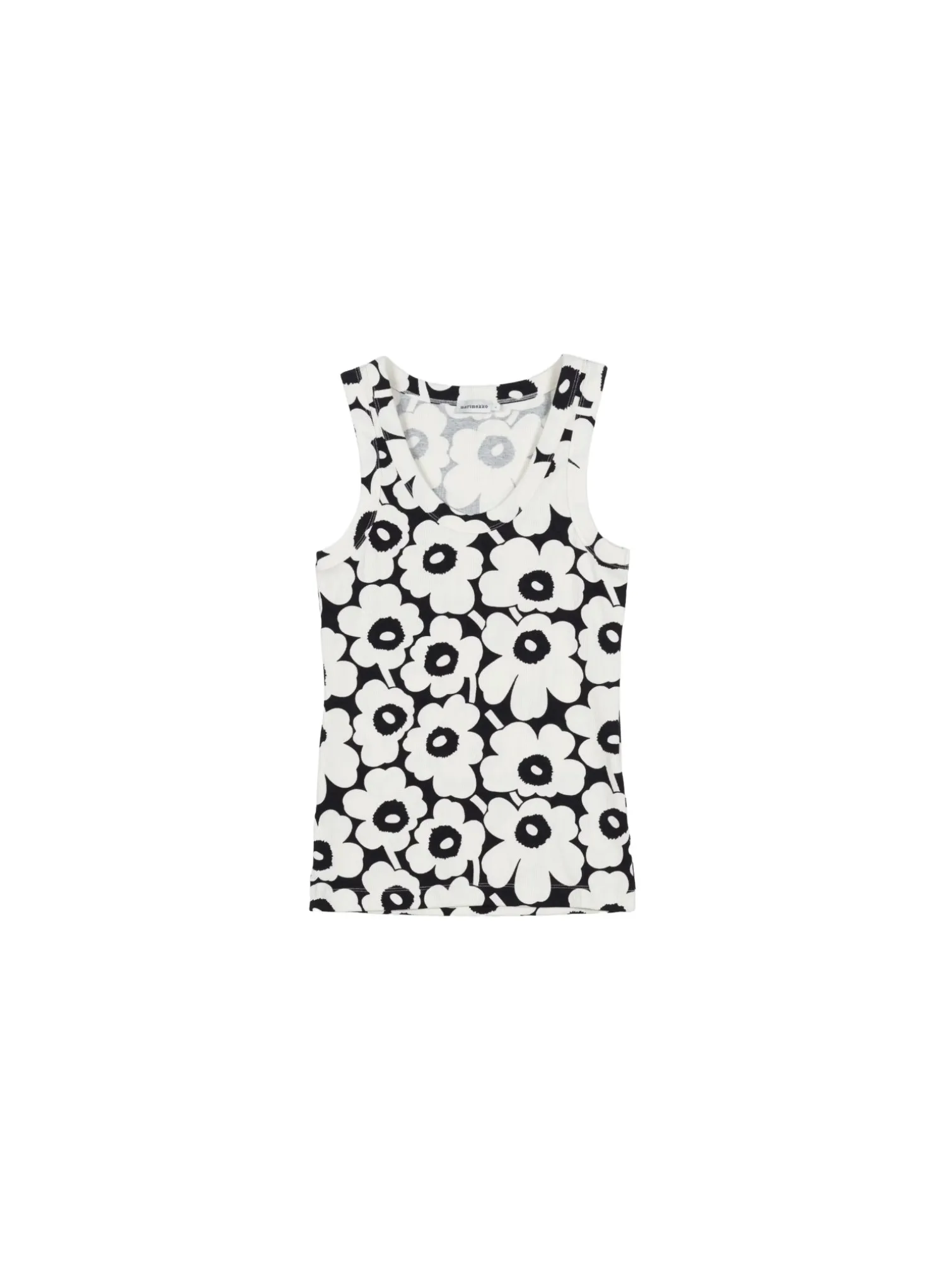 Linen Uusia Unikko from Marimekko. A ribbed linen with a ruffled front and high back. The linen is floral which makes it the perfect garment to elevate a basic outfit!